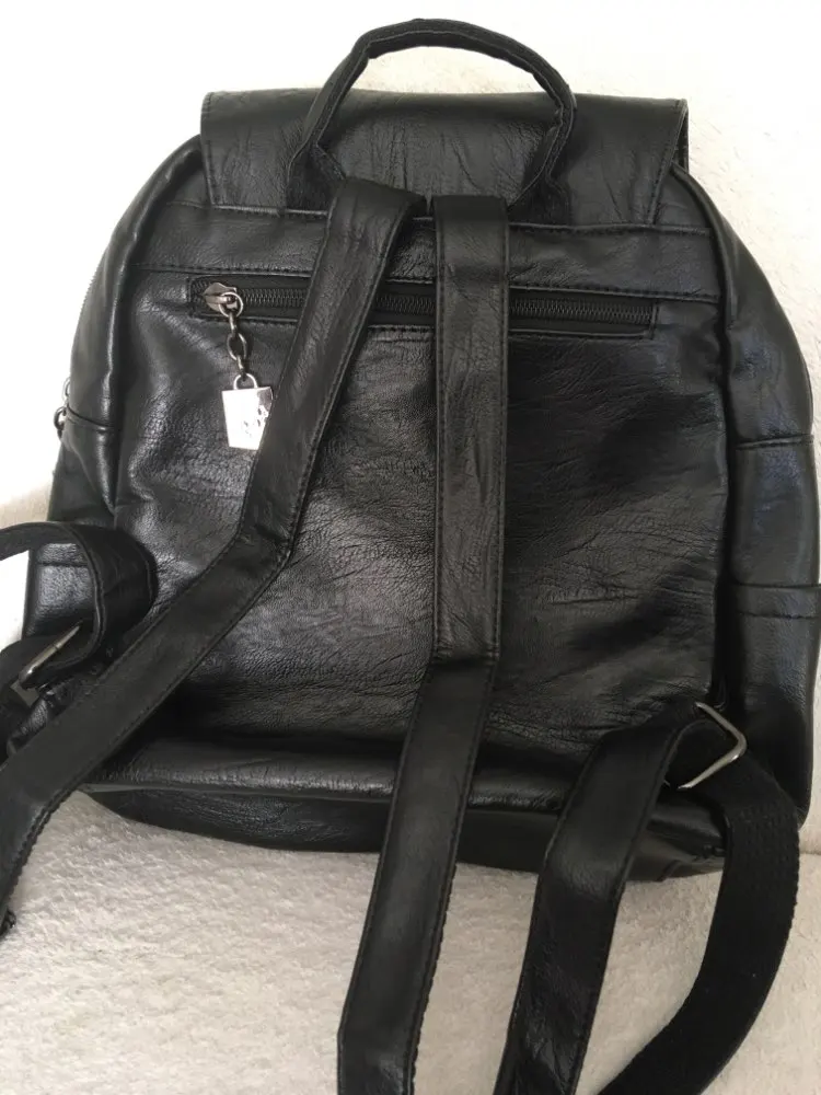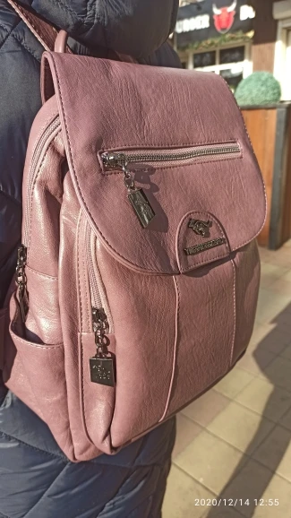 Быстро дошёл рюкзачок. Заказала 27.11.,а на почте был 16.12.,в СПб. Рюкзак мне очень понравился. Похож на кожаный)). Два отдела. Внутри, в большом отделе, имеется три кармана, два из них на замке. Со стороны "спины", один карман на замке. По бокам, небольшие кармашки. Ремни, на рюкзаке, с одной стороны, прошиты тканным материалом. Так же имеется небольшая ручка, чтоб держать рюкзак. А вот на передней поверхности рюкзака,где логотип, замок-"обманка". Теперь буду тестировать)).