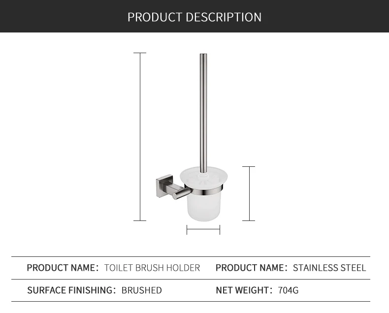 Особенности и характеристики:Набор аксессуаров для ванной комнатыКольцо для полотенец/держатель для туалетной щетки/держатель для бумаги/Крючок для халатаМатериал: Прочная нержавеющая сталь SUS 304Использование: ванная комната/душевая комната/туалетОтделка: высококачественная матовая поверхностьТип: аксессуары для ванной комнатыУстановка: НастенныйВключая все монтажные фитинги