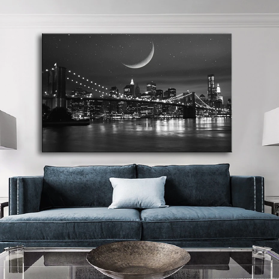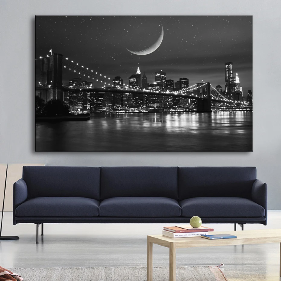 Черно-белый город красивый ночной вид большой холст картина плакат ...