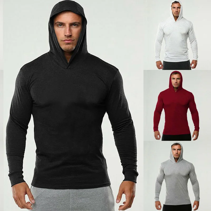 Футболка мужская для бодибилдинга, бега, фитнеса, с длинным рукавом и капюшоном