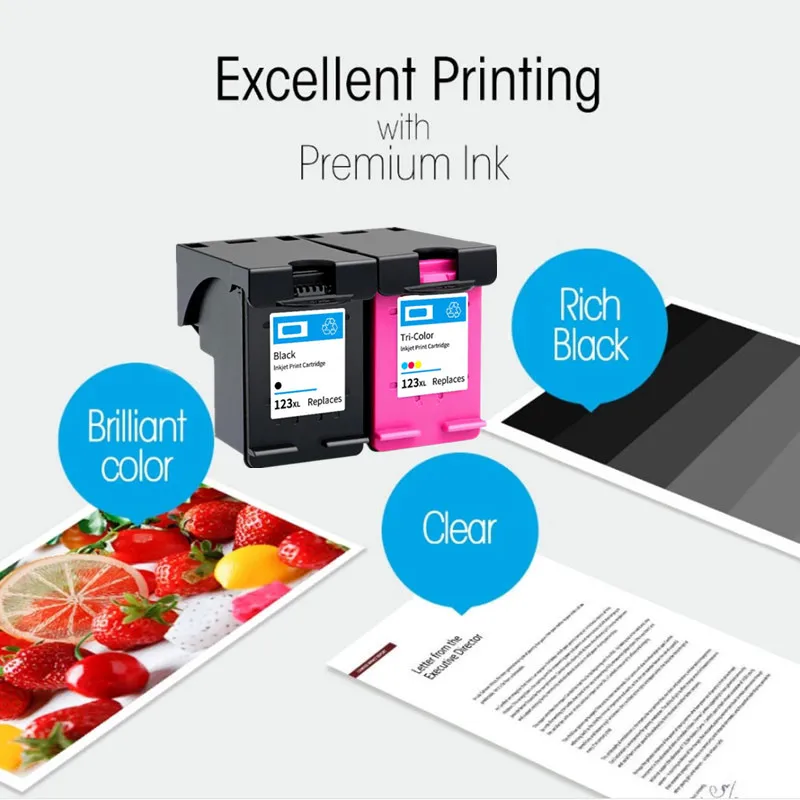 Модель продукта: Восстановленный чернильный картридж для HP 123XLХарактеристика: ВосстановленныйМодель: F6V19AE & F6V18AEЦвет картриджа: черный и трехцветный (C/M/Y)Объем: Bk-18ml, Tri-color-17mlСовместимый принтер:Для принтеров HP Deskjet 1110 / 2130 / 2132 / 2133 / 2134 / 3630 / 3632 / 3637 / 3638;Для принтеров HP ENVY 4513 / 4520 / 4521 / 4522.Для принтеров HP Officejet 3830 / 4560 все-в-одном.Если ваш оригинальный чернильный картридж 123 или 123XL, наш картридж подойдет для вашего принтера.