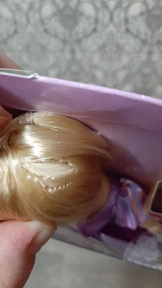 Кукла прекрасная! На личике около глаз пятна клея, но выглядит не критично, будто слезки. Ещё было небольшое черное пятнышко, которое спокойно вывелось ацетоном. Волосы очень сильно залачены, но выбиваются отдельные волосики, что особенно хорошо видно на белом воротнике. Коробка в ужасном состоянии, будто ей кололи орехи, но кукла не пострадала. А еще продавец заклеил упаковку скотчем с Микки Маусом :3 Из-за пандемии ждала куклу 3 месяца, но, слава Богу, она дошла в целости.
