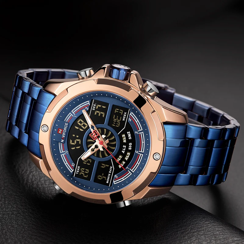 Новинка, мужские часы NAVIFORCE, полностью стальные, кварцевые, мужские наручные часы, военные, двойной дисплей, водонепроницаемые, спортивные, цифровые, мужские часы для мужчин