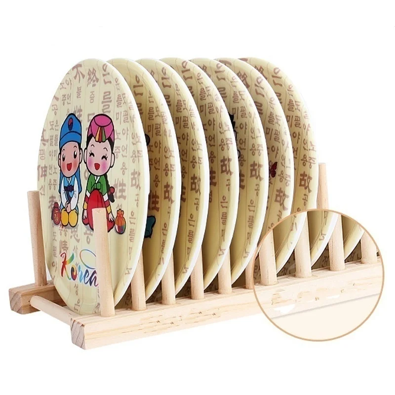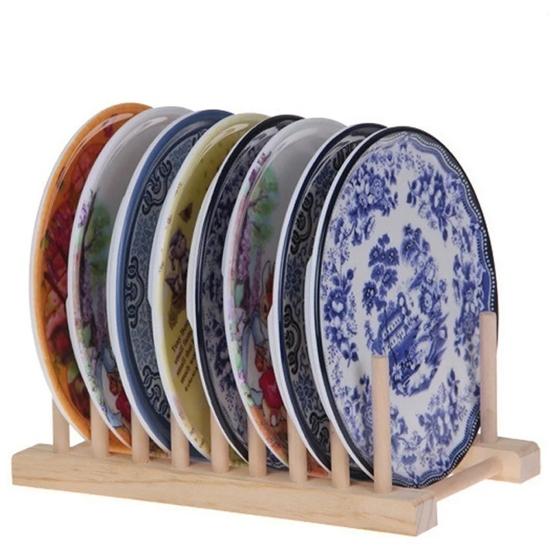 Дерево гладкое. Для больших тарелок не подойдёт. Тарелки заваливаются. Если тяжёлые, то есть риск, что сломаются вертикальные вставки. При сборке сломала поперечину. Она просто переломилась совсем. Цена 297 руб. До СПб почти 2 месяца шло. У нас купила металлическую подставку за 296 руб. Мне она больше понравилась. На последнем фото для сравнения.