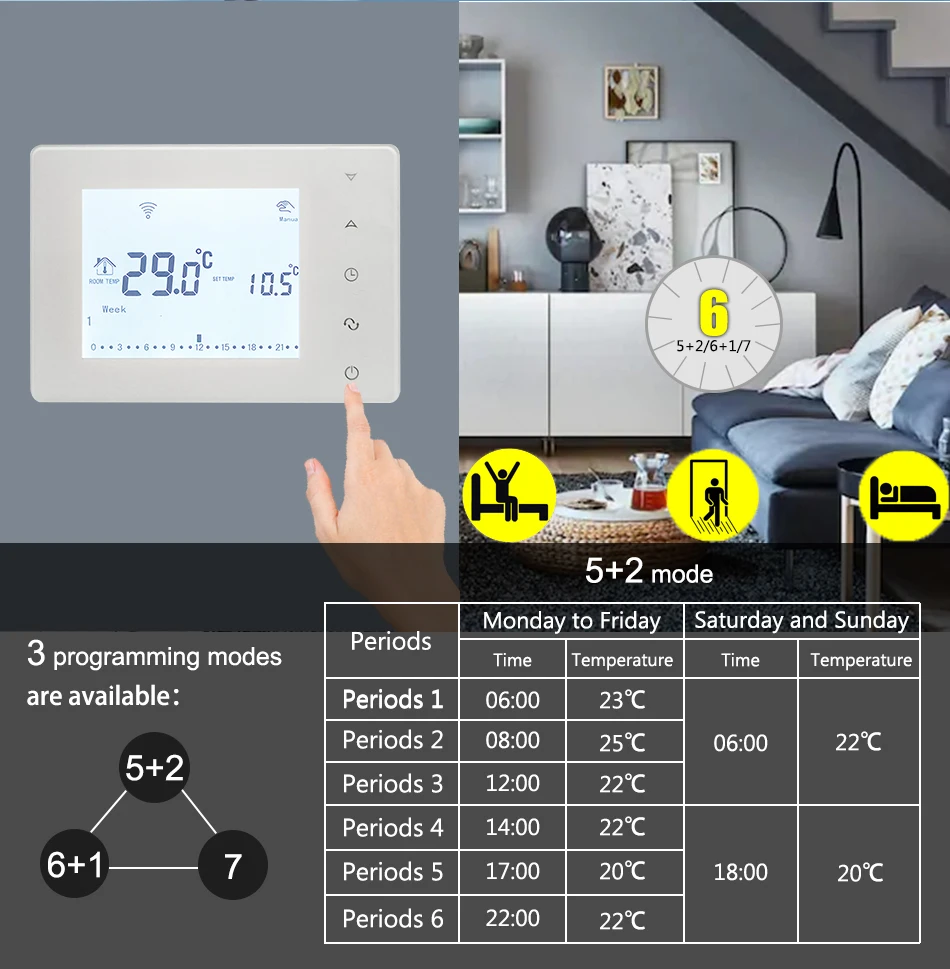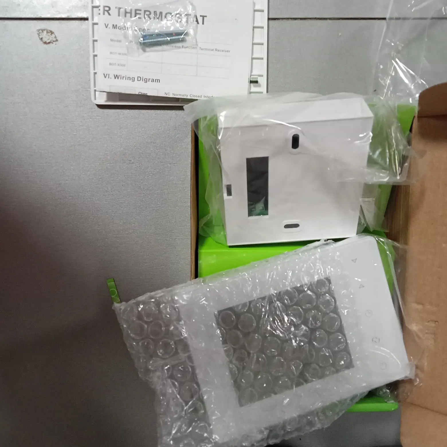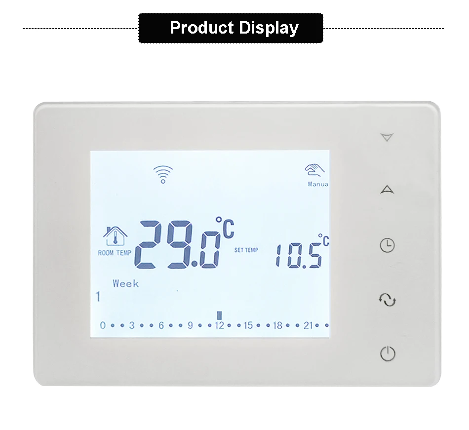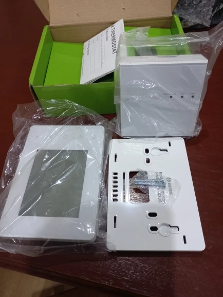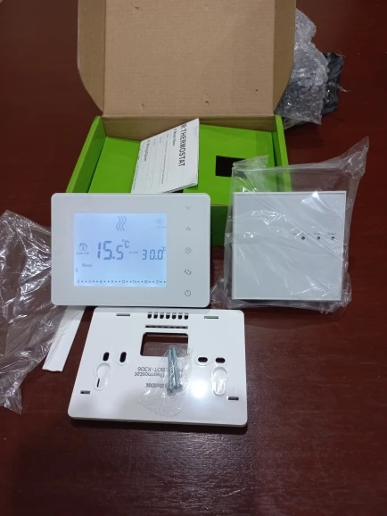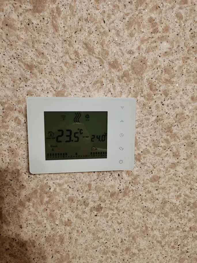 Хороший термостат, можно запрогромировать на любое время включения термостата, Привлекательный внешний вид. Лёгкая установка, интуитивно всё понятно. Посылка пришла быстро, трек номер отслеживался. Посмотрим как будет вести себя во время работы.