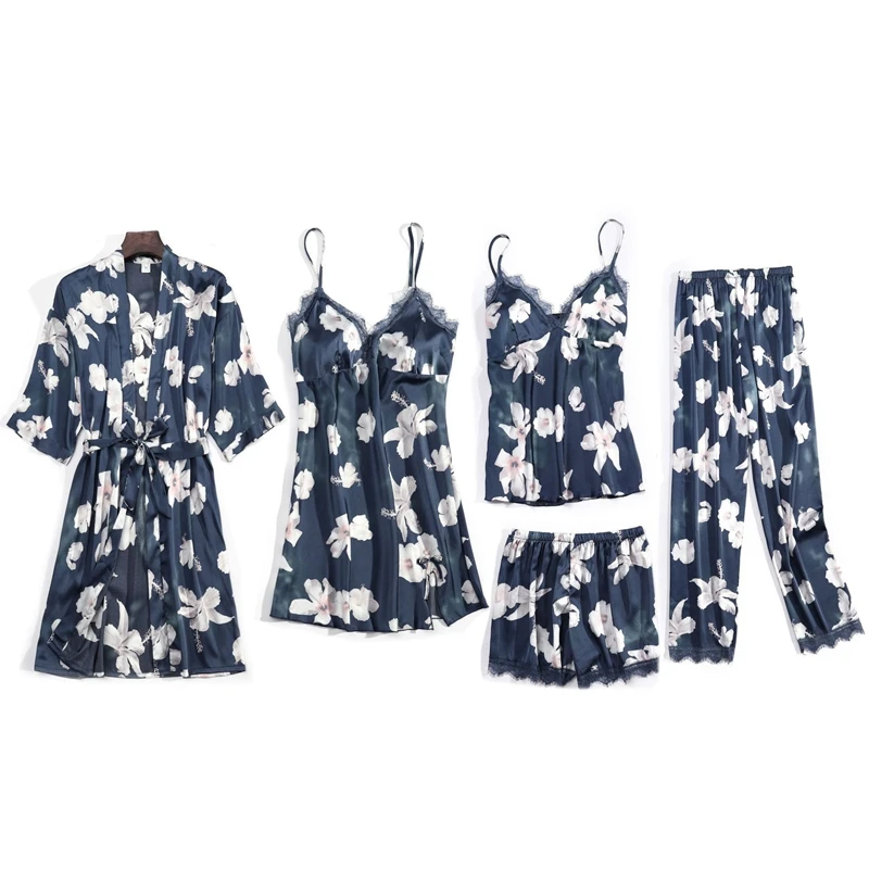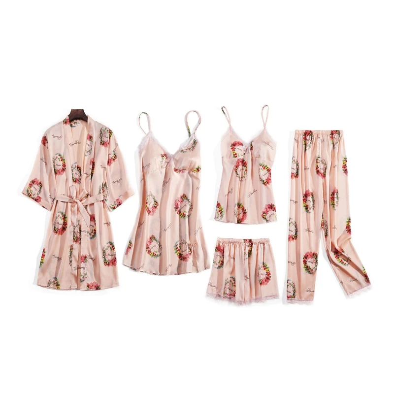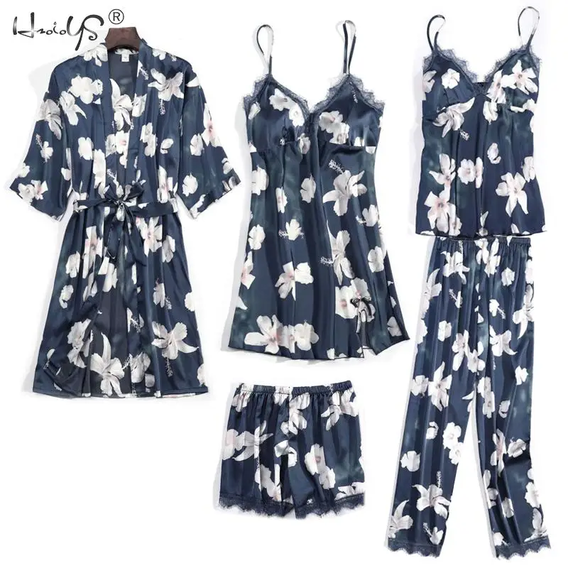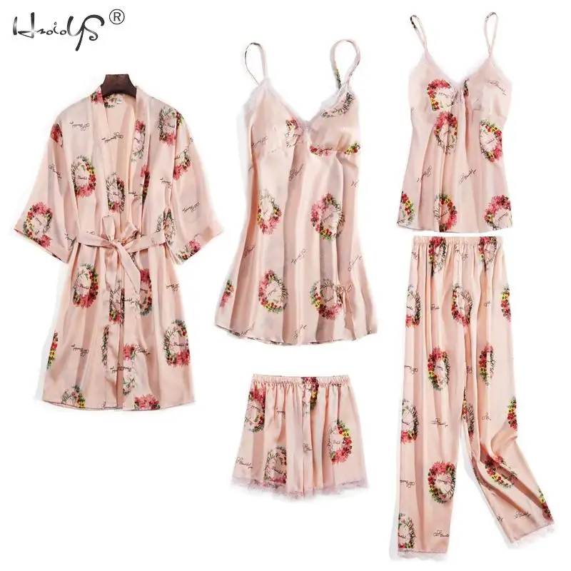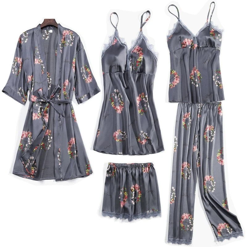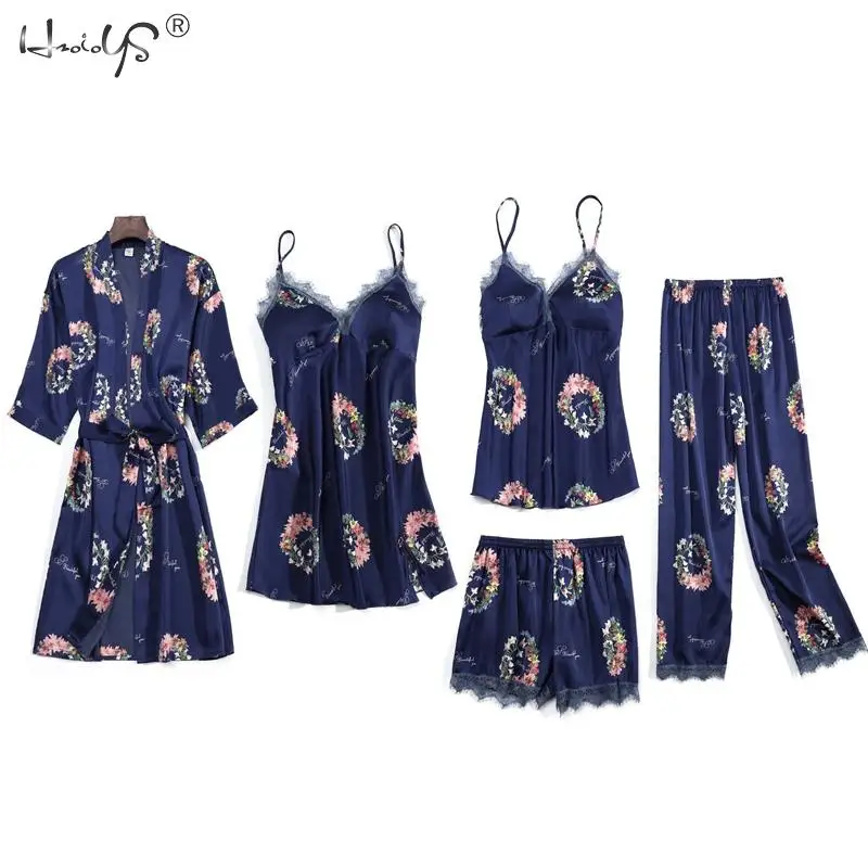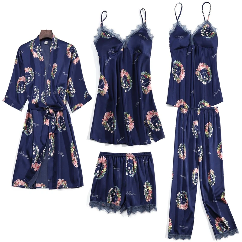 Пижама женская атласная из 5 предметов, одежда для сна, шелковая Домашняя одежда, пижама с вышивкой для сна и отдыха, халат и ночная рубашка