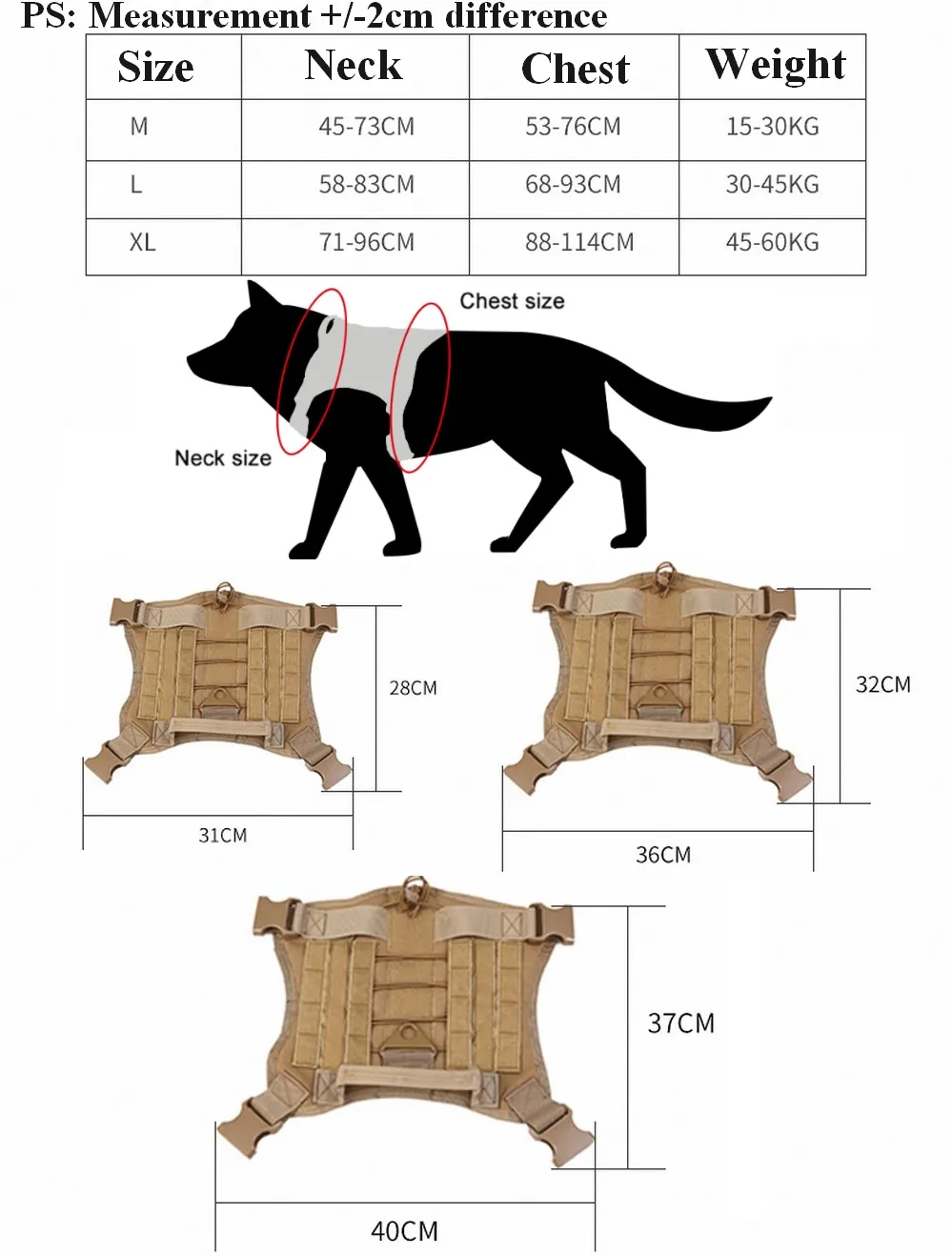 Прочный материал и мягкая подкладка: Изготовлен из высококачественного нейлона 1000D и хорошо проложен во всех областях давления для удобной посадки.Легкий регулируемый поводок для собак: 4 быстросъемные пряжки для удобства надевания и выключения, обеспечивая дополнительную безопасность; С одной верхней ручкой для свинца и управления вашей собаки и одним v-образным кольцом на передней части для крепления собачьего поводка.Система MOLLE: каждая сторона оснащена двумя ремнями MOLLE, а также панелью hoop & loop strips, чтобы легко прикрепить Молле или ID-панели.Доступно в 4 цветах и 3 размерах: измерьте обхват груди вашей собаки, чтобы подобрать подходящий размер. (Таблица размеров приведена на рисунке)
