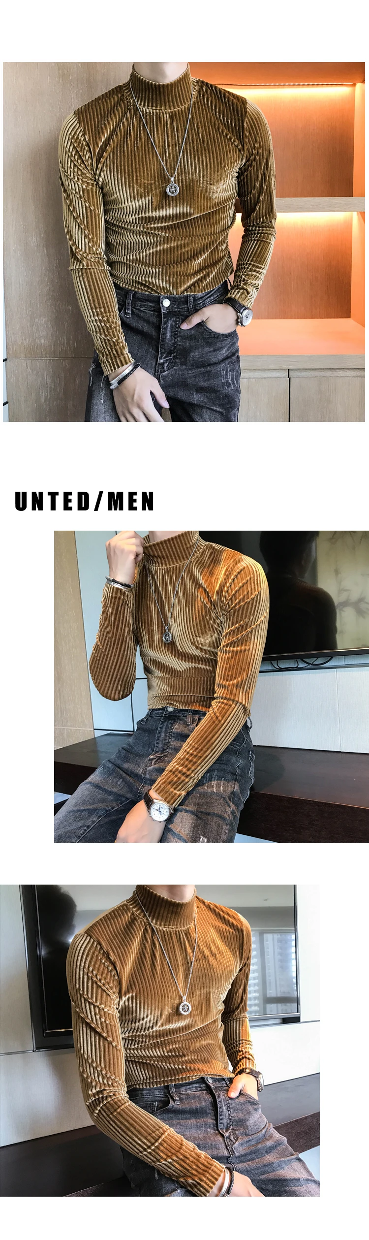 Мужская бархатная футболка с воротником-стойкой, облегающая футболка в полоску с длинными рукавами, Клубная одежда, осень 2019