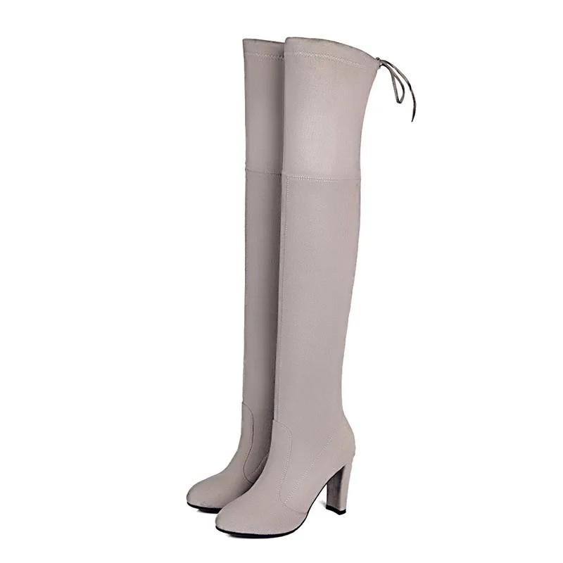 Женские сапоги выше колена из флока, на шнуровке, на высоком каблук...