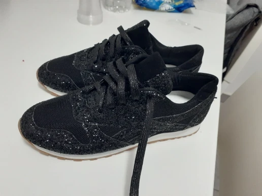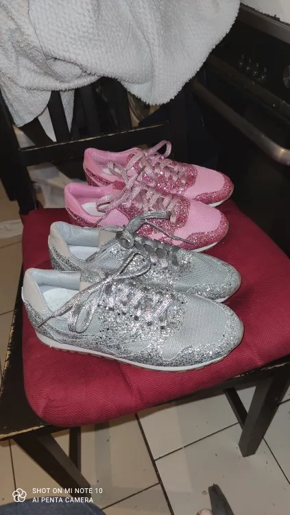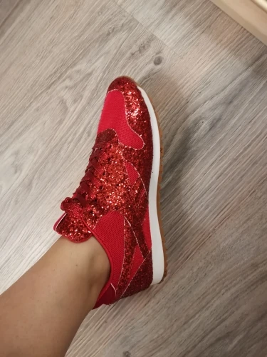 Обувь блестящая, и она абсолютно очень удобная. Сверху блестки выглядят очень шикарно. Мне очень нравится этот товар. Эти туфли идеально подходят для занятий спортом или прогулок.