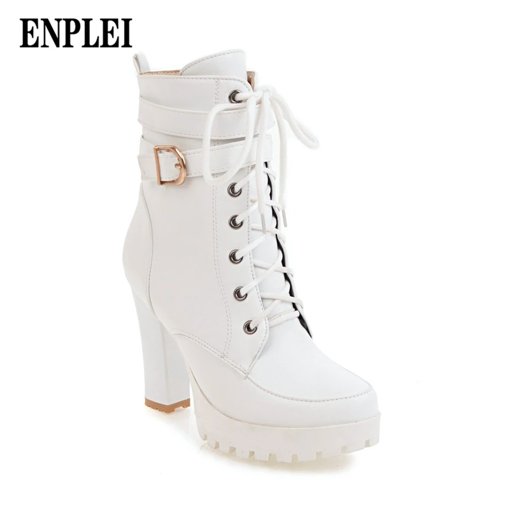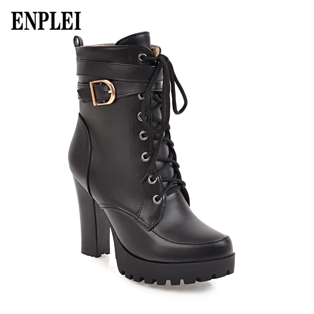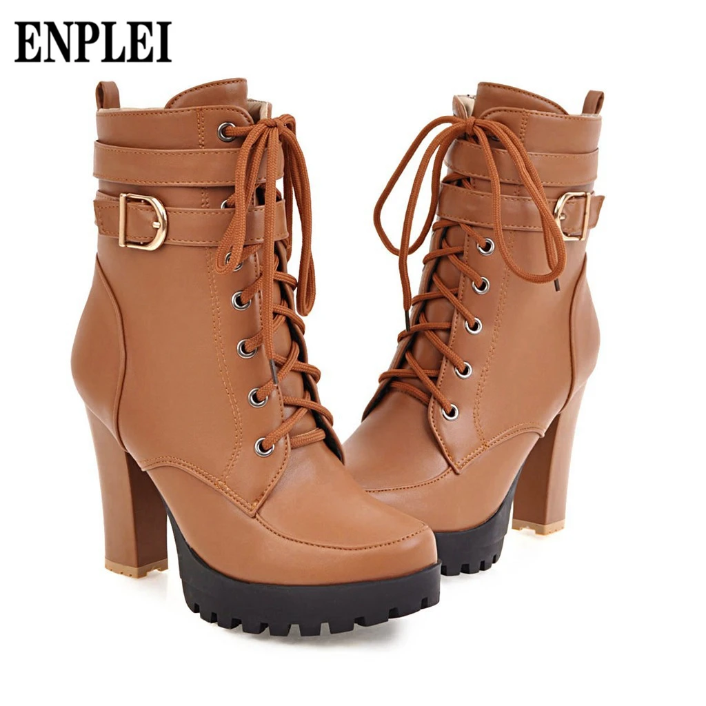 Enpleiженские ботильоны на не сужающемся книзу высоком массивном каблуке на шнуровке; Сезон осень-зима; Женские ботинки на платформе; Модная обувь; Большие размеры 34-43