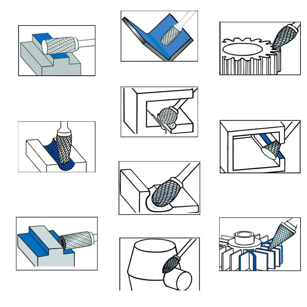 Карбид вольфрама заусенцы широко используются в промышленных отраслях, таких как машиностроение, авиация, автомобиль, судостроение, химическая техника и гравировка процесса. Основные виды использования: