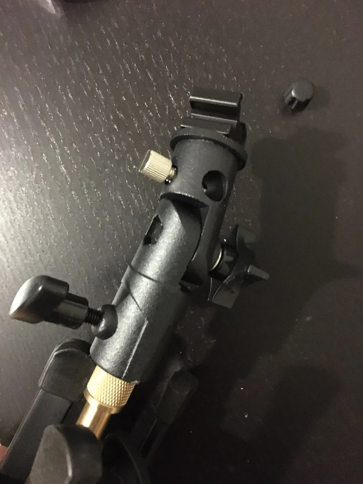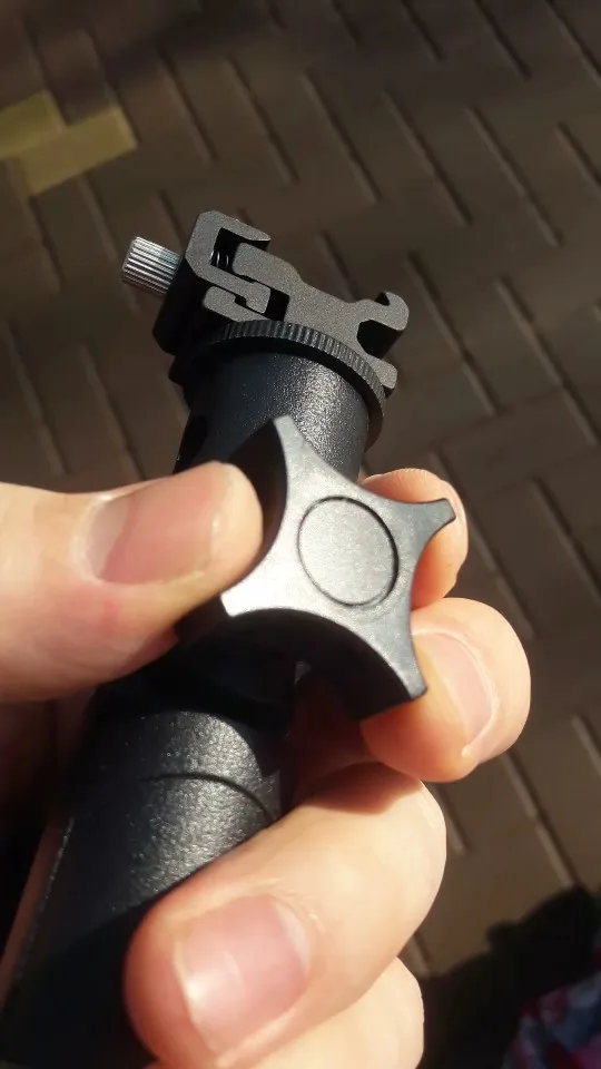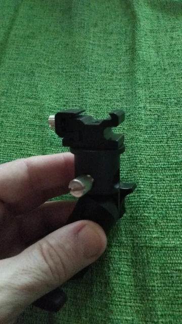 металлический, тяжёленький, фиксируется надёжно. верхнюю площадку под горячий башмак открутила, она показалась мне ненадёжной, под ней есть винт как на обычной стойке или штативной голове.