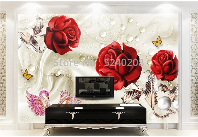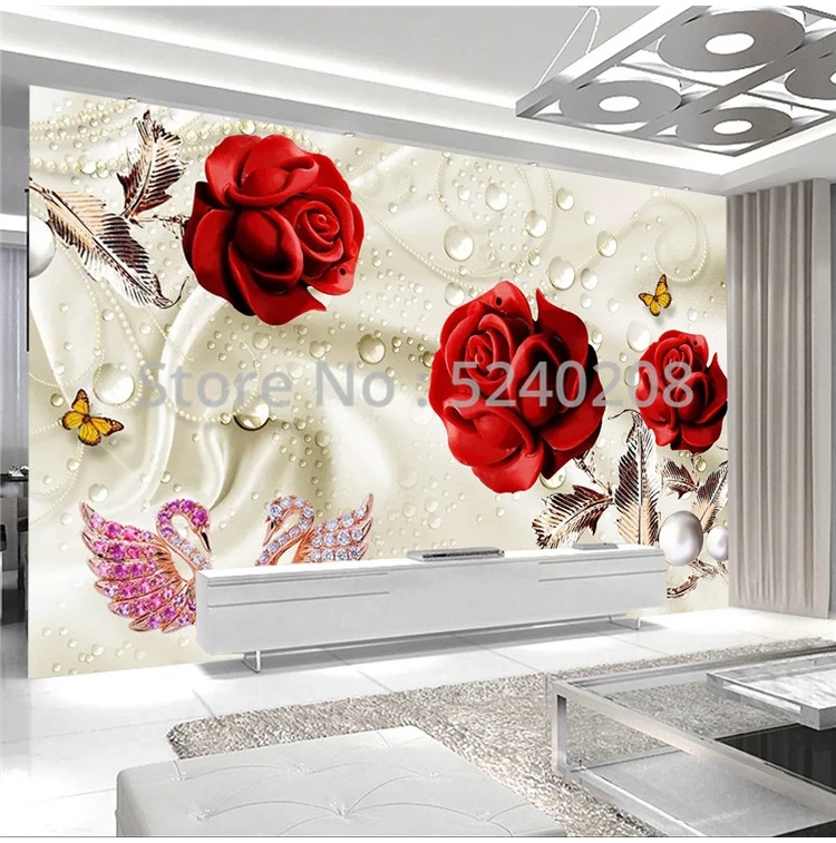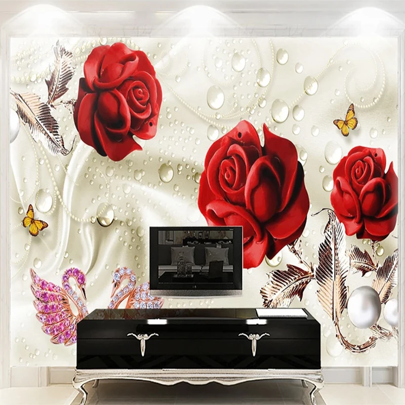 Пользовательские самоклеющиеся обои 3D абстрактные креативные красные розы цветы Лебедь шелковые фрески Гостиная ТВ наклейки на стену за диваном постер