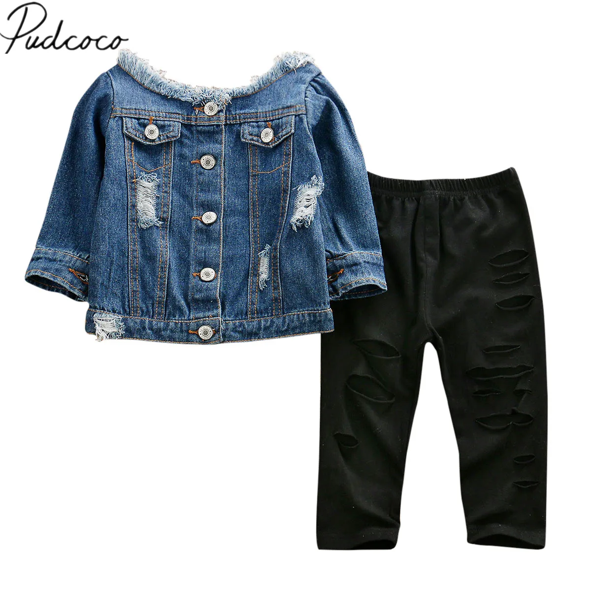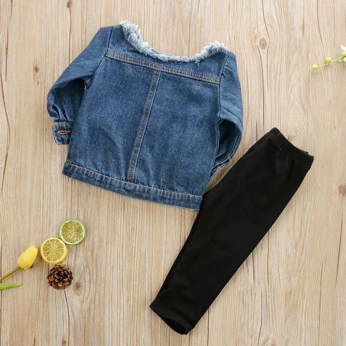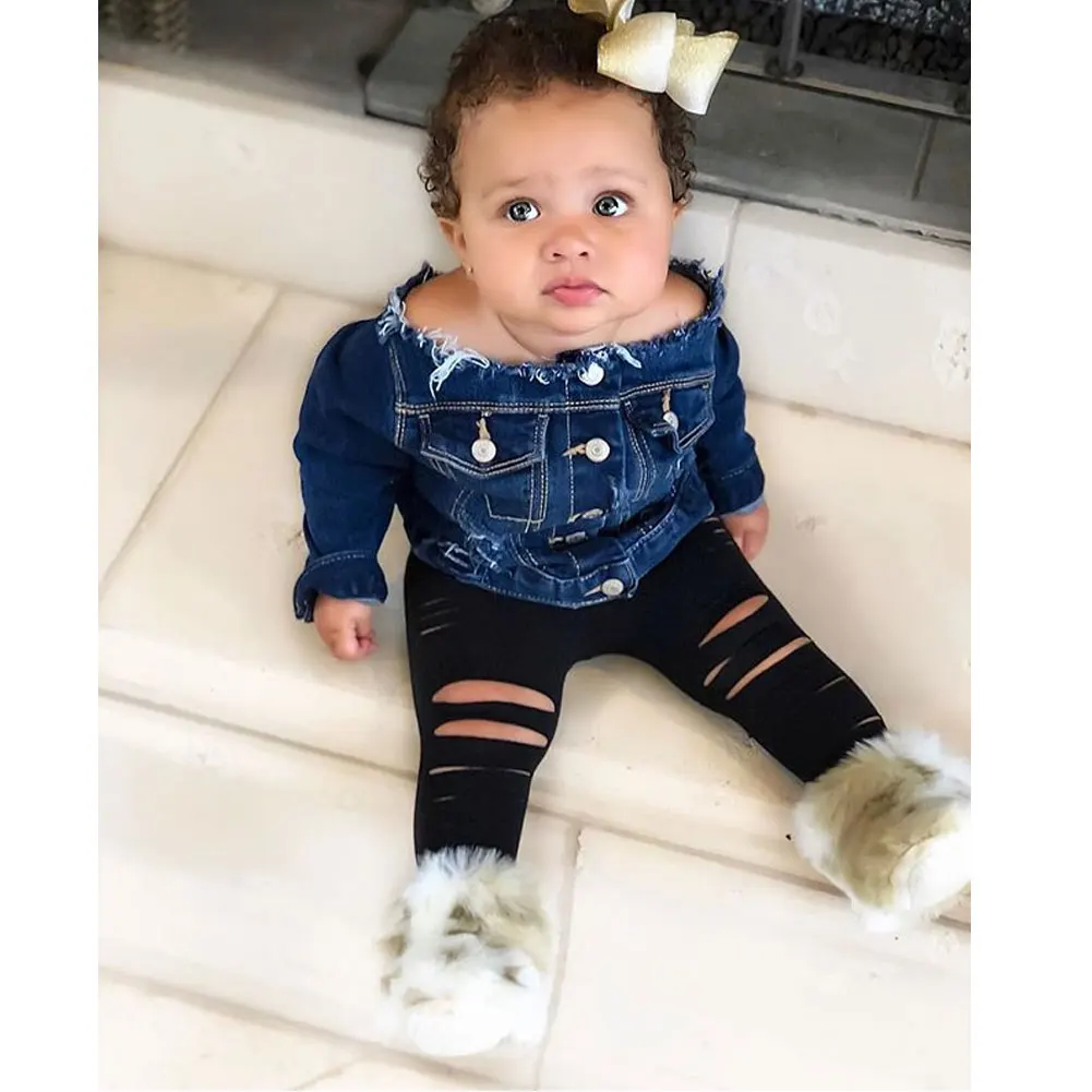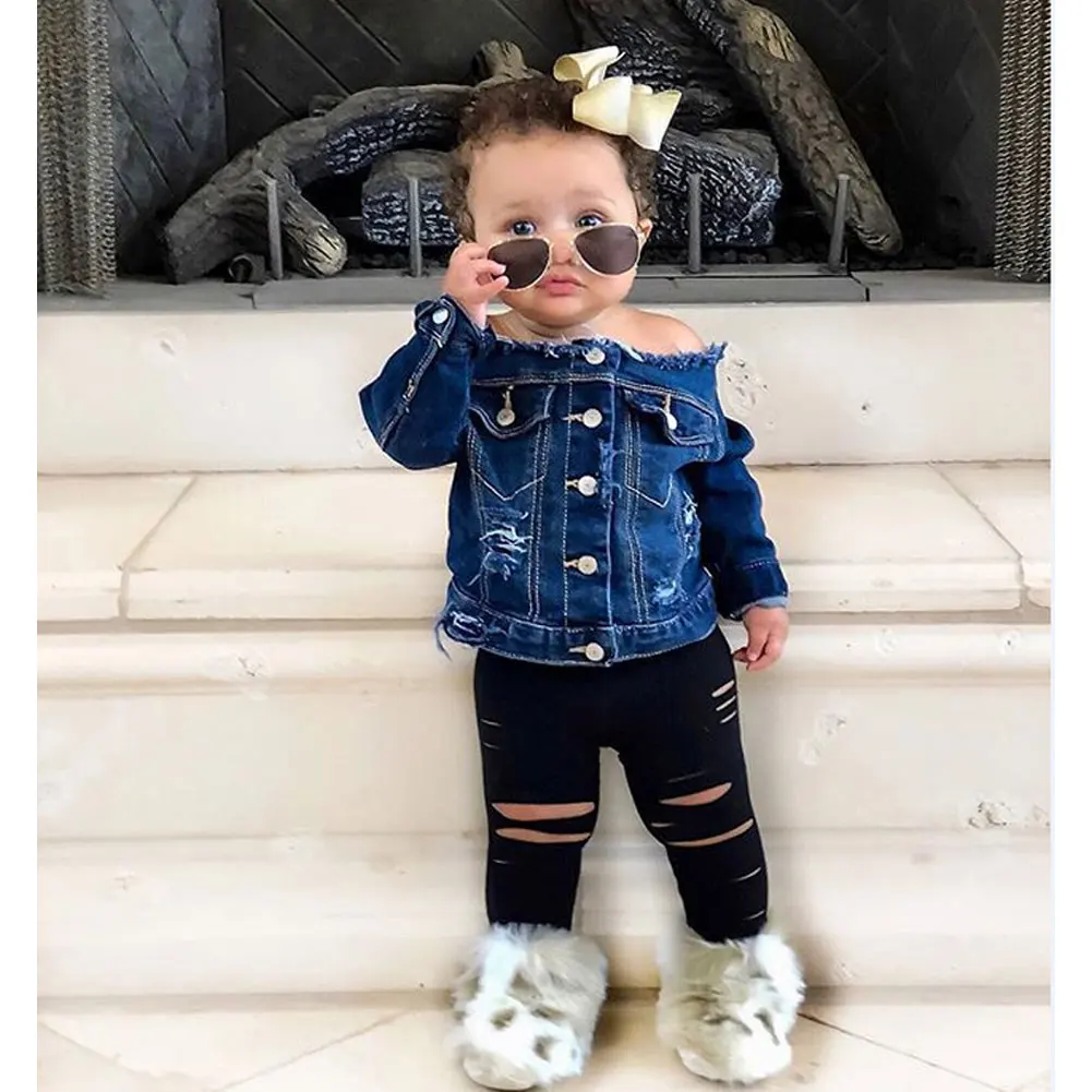 Весенне-осенняя одежда для малышей, джинсовые топы с открытыми плечами для маленьких девочек + штаны с прорезями, модные комплекты одежды из 2 предметов, От 1 до 6 лет, 2019