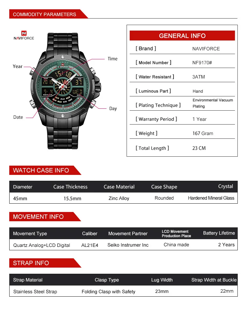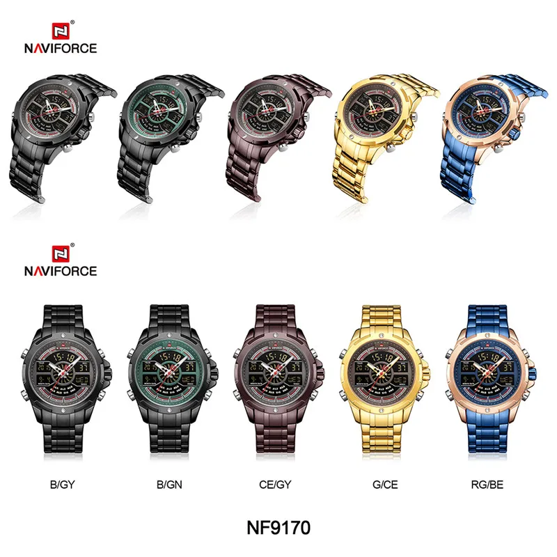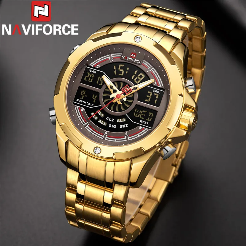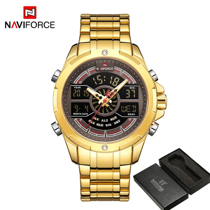 Часы наручные NAVIFORCE Мужские кварцевые цифровые, спортивные брендовые роскошные золотистые в стиле милитари, с двойным циферблатом, из нержавеющей стали, 9170