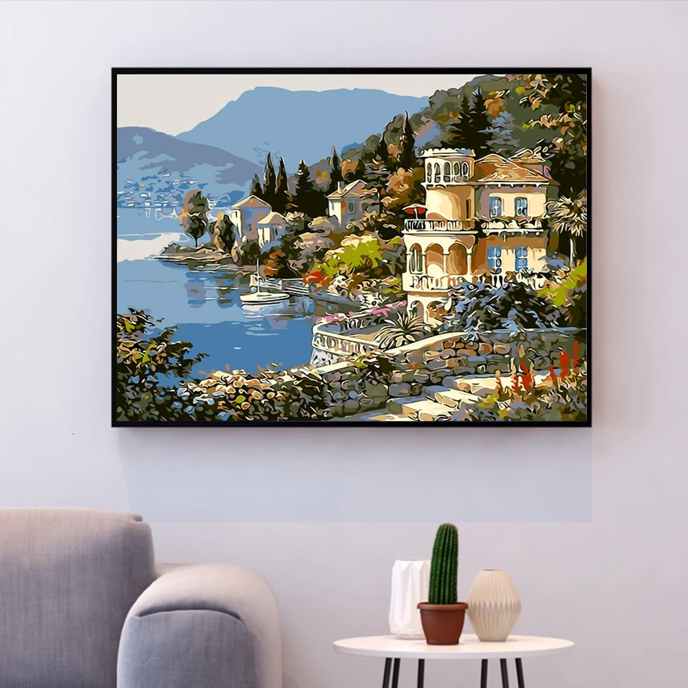 HUACAN картина маслом по номерам приморский город акриловый рисунок холст Пейзаж картина для взрослых стены искусства DIY домашний декор