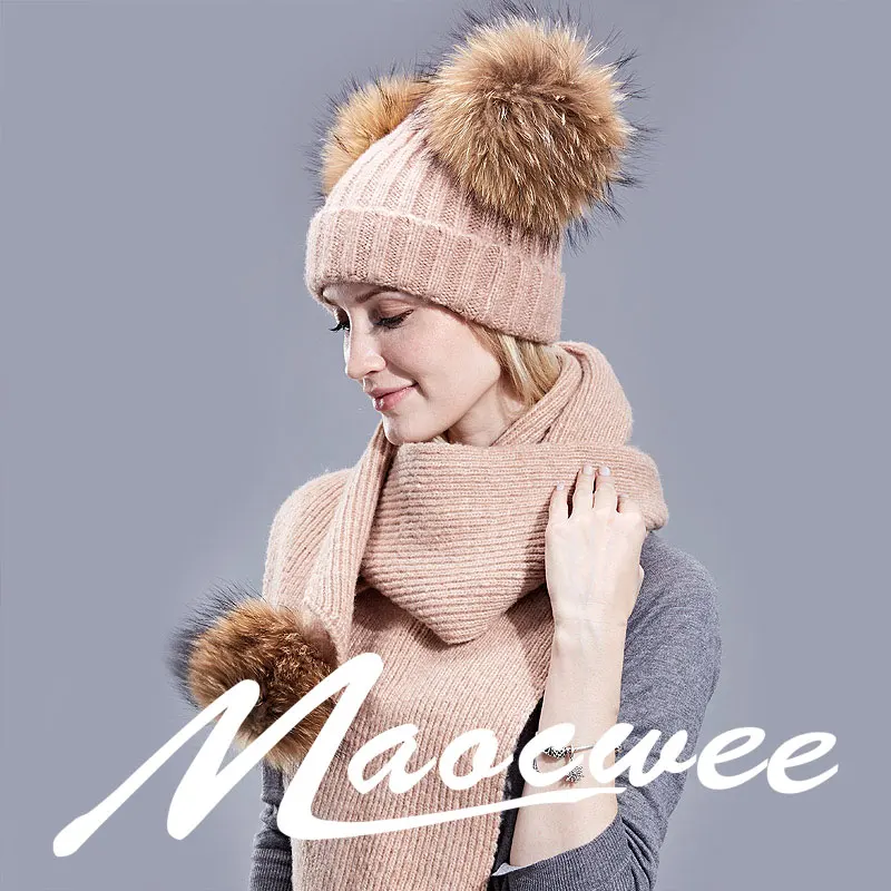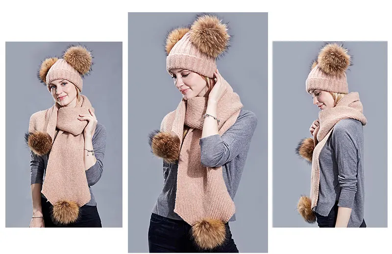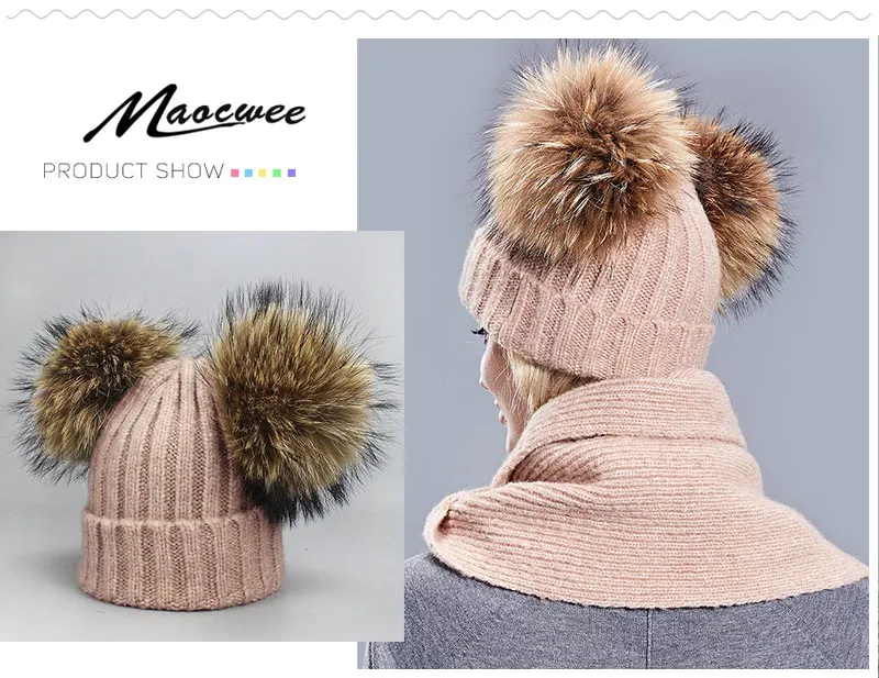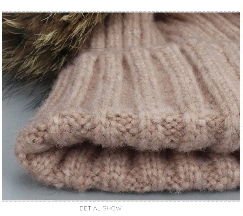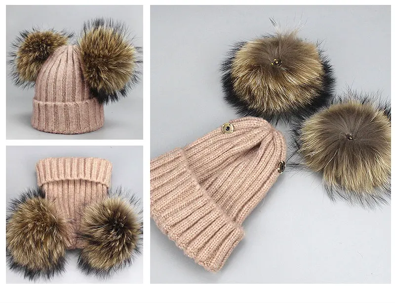 Женская шапка с помпоном из меха енота, зимние теплые шерстяные шап...