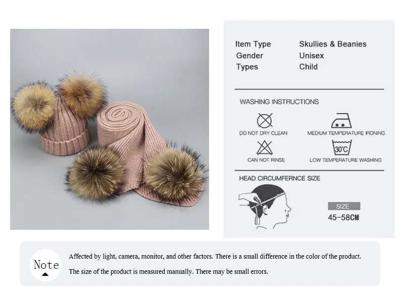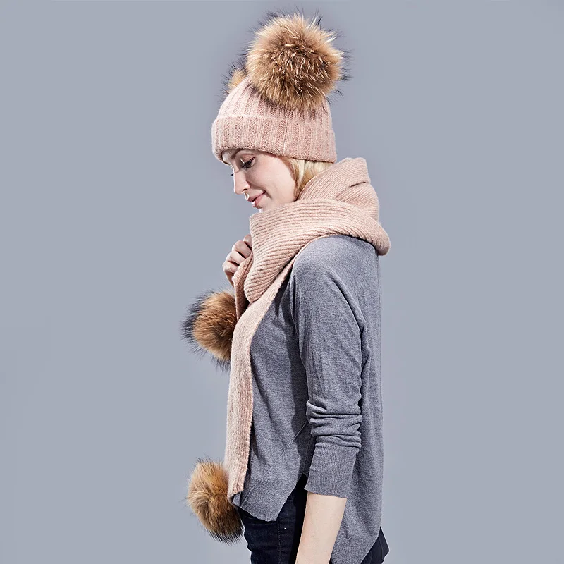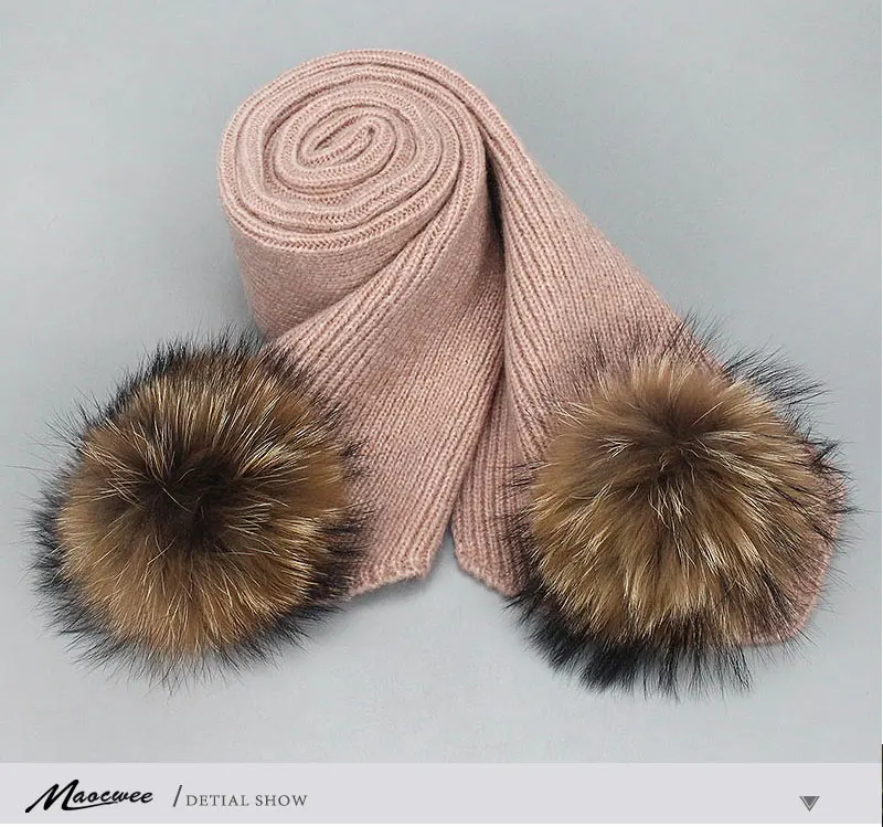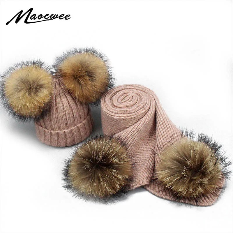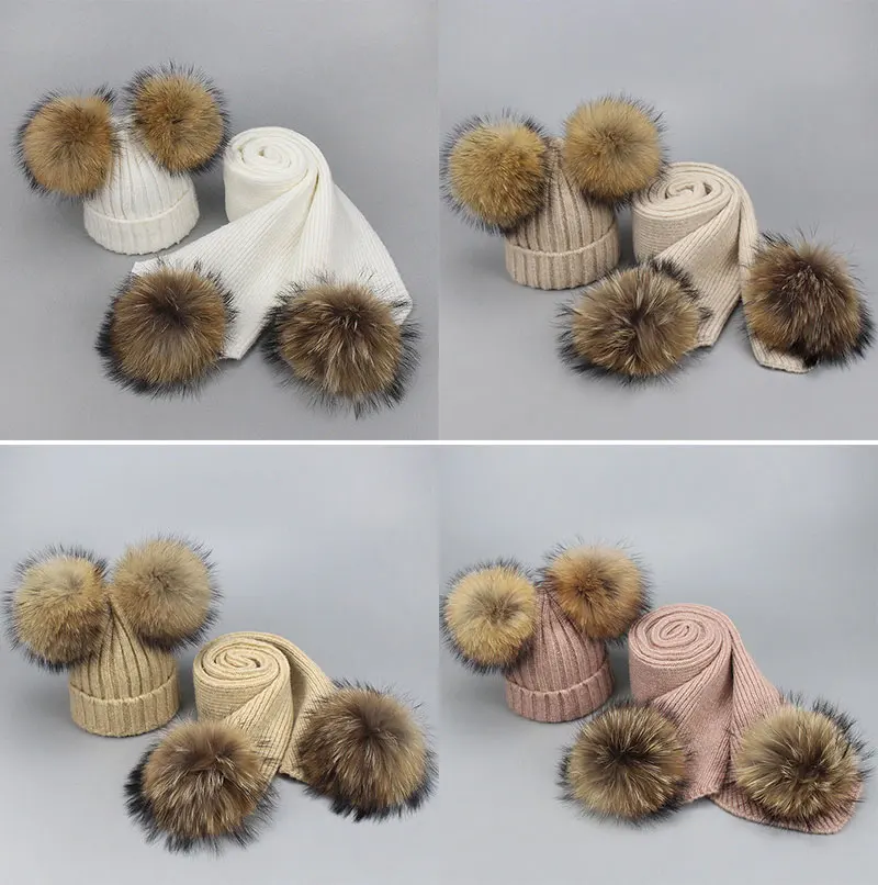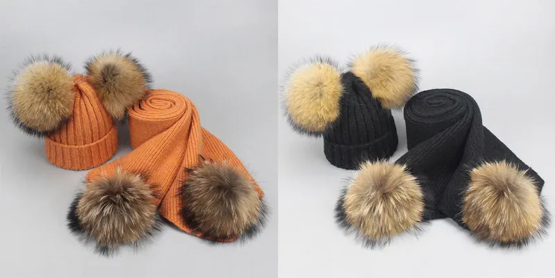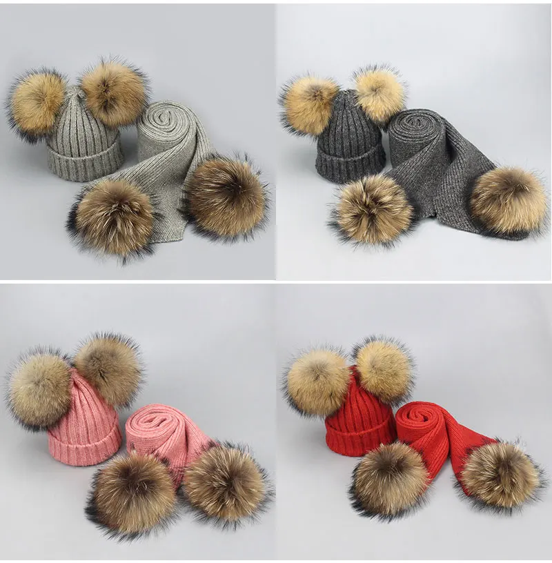Детский комплект из шапки и шарфа с помпоном из натурального меха енота, зимняя вязаная шапка с помпоном из натурального меха, плотная теплая шапка
