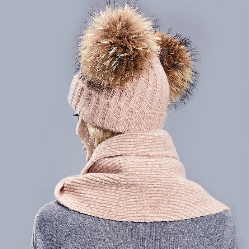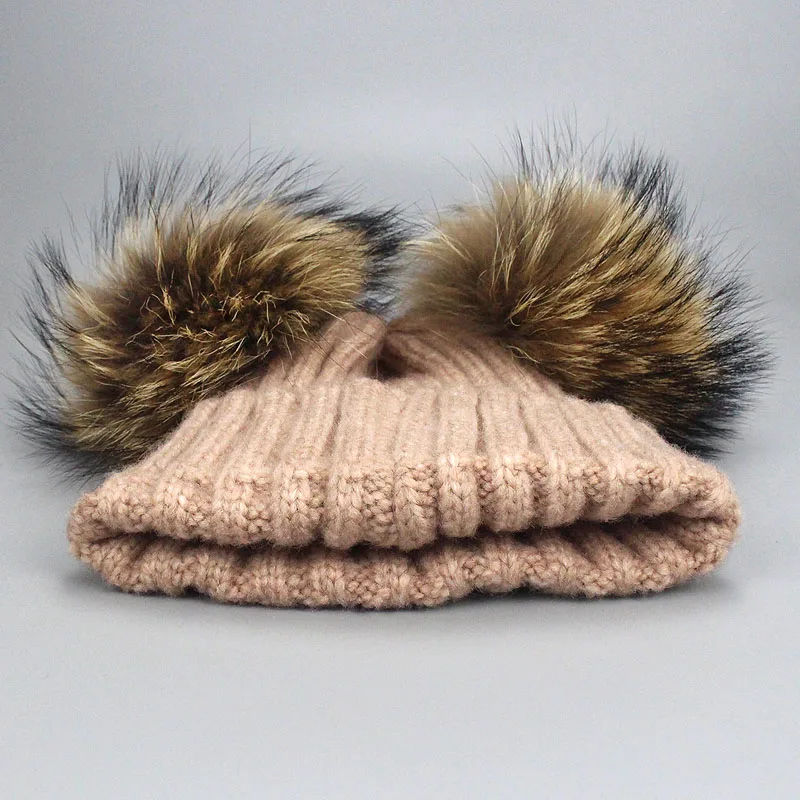 Шапка детская зимняя из шерсти и хлопка, с двумя помпонами из натур...