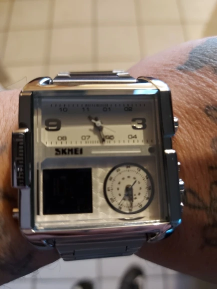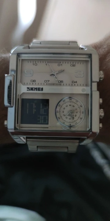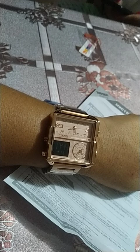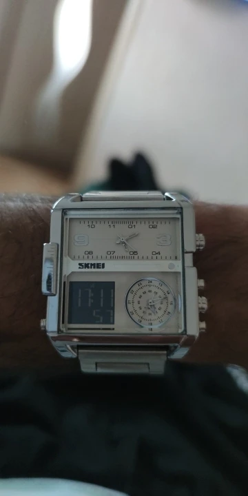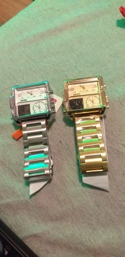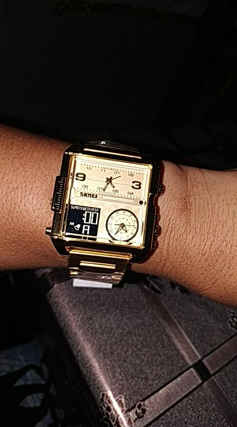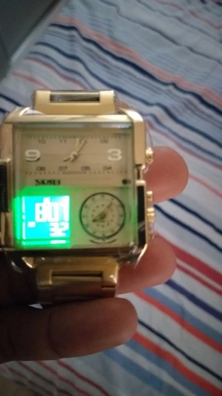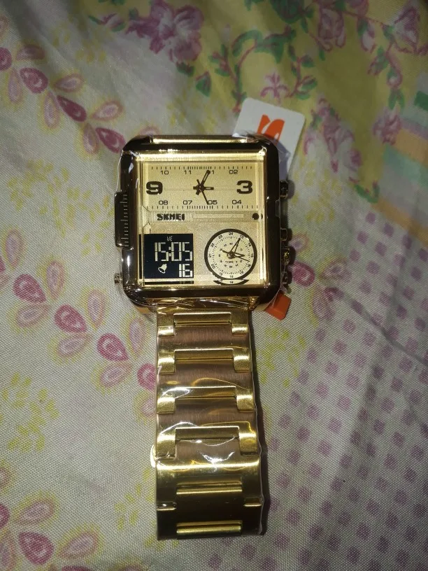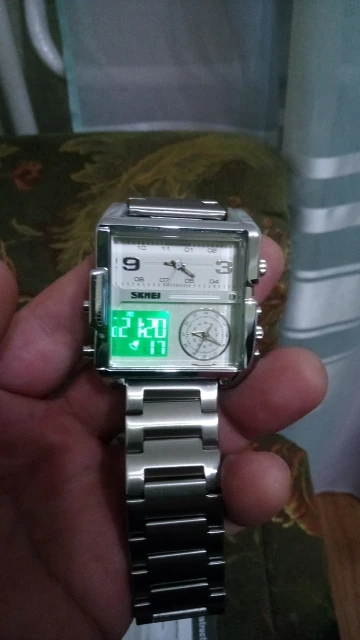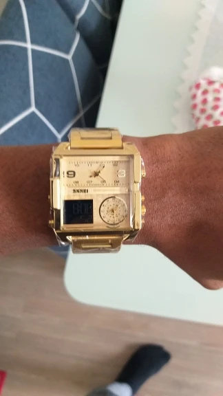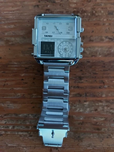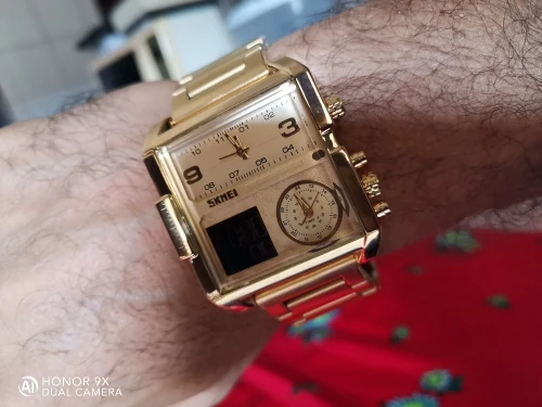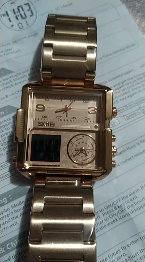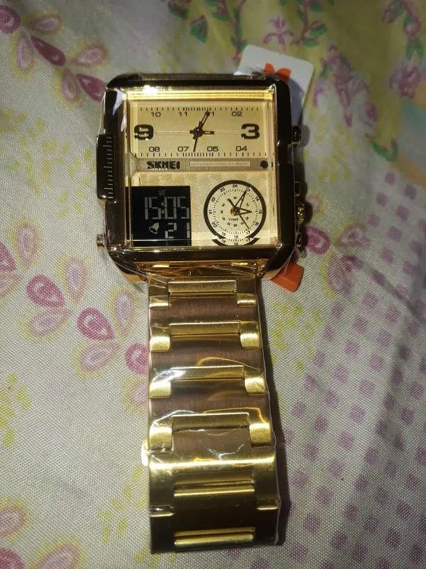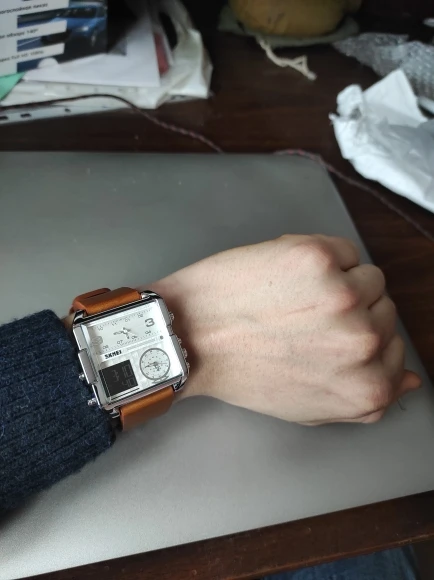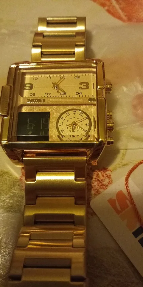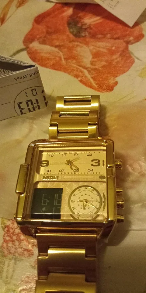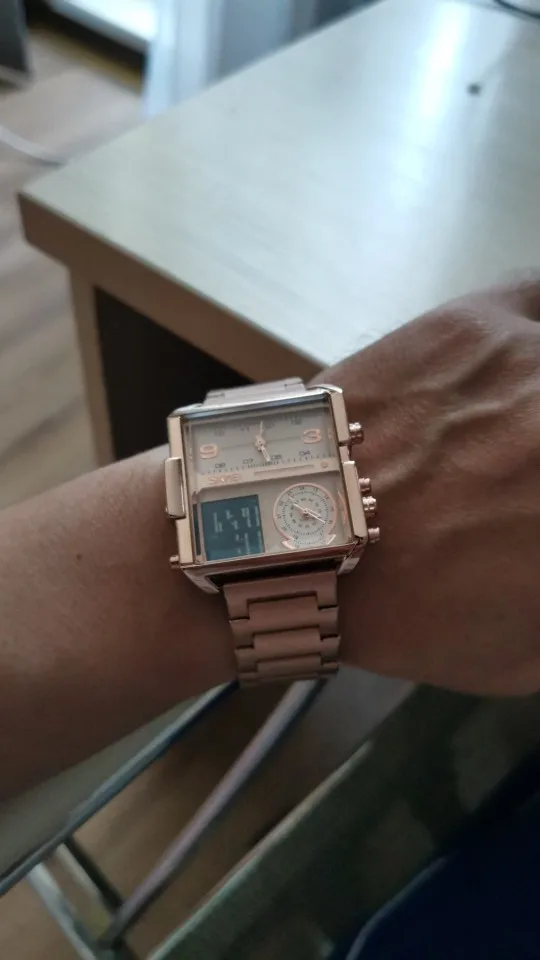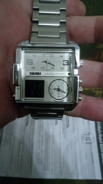 Часы очень шикарные. в реале смотрятся на много красивее чем на фото. Даже посторонние люди замечают и говорят ,что очень красивые часы. Но есть и минус. Для людей которым по мимо красоты нужно знать число и месяц , этого нет. На электронных часах нужно постоянно включать свет , а кнопка вкл света не внушает доверия. Хронометраж слишком мелковат у кого слабое зрение нужно присматриваться. На верхних часах точное время не скажешь из за растянутости экрана. В общем часы красивые , большие , приятно тяжелые , браслет тоже большой соответсвует заявленным размерам. Время смотреть не удобно. Но привыкнуть можно. РЕКОМЕНДУЮ!!! Шли оооочень долго. До Алтайского края почти три месяца.
