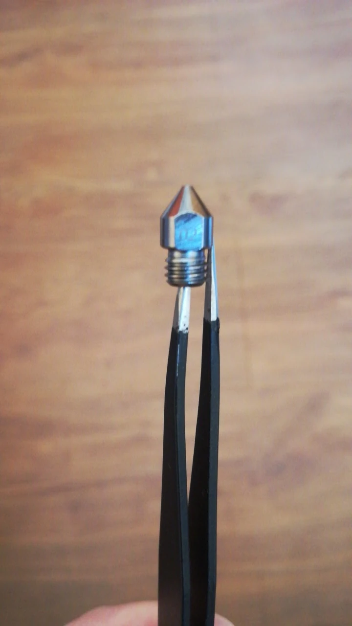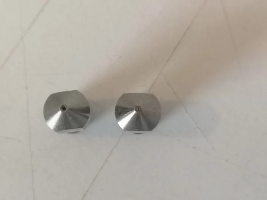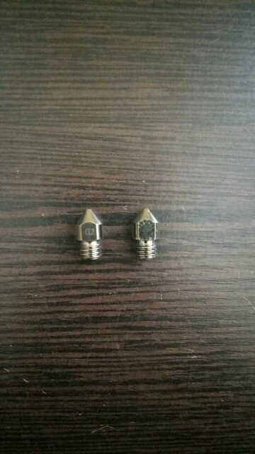 Сопла с виду неплохие, за эти деньги норм. Но кончик недостаточно гладкий, требует полировки или будет полосатить на отпечатках. При полировке закрадывается сомнение в материале, т.к. начинает проглядывать что-то подозрительно похожее на латунь. (см. фото)