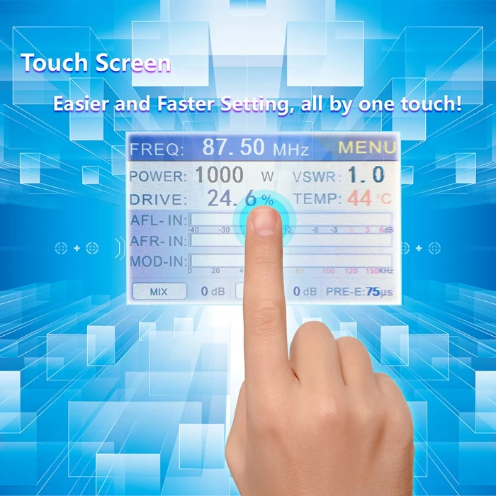 Этот fm-передатчик V3.0 350w разработан с точно чувствительным сенсорным экраном Вместо кнопок управления на предыдущих передатчиках. Со всей информацией, отображаемой на экране, пользователи могут очень легко контролировать и настроить все параметры.