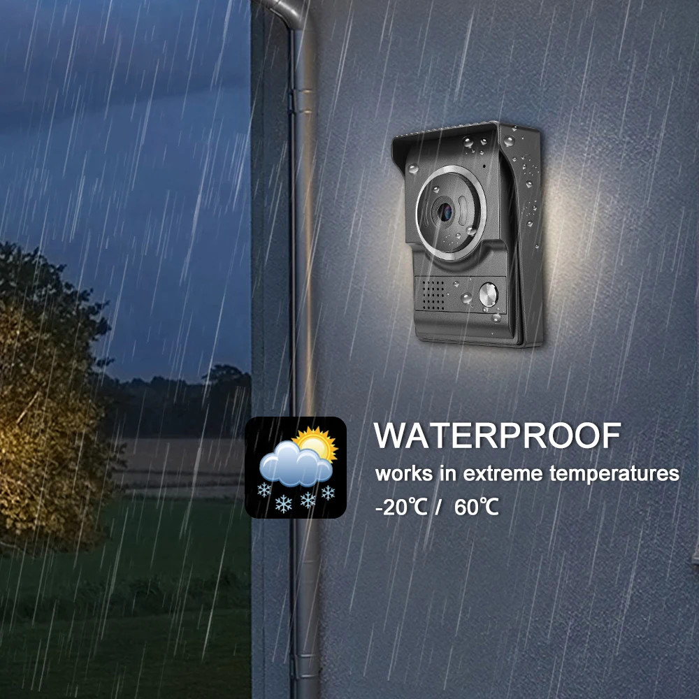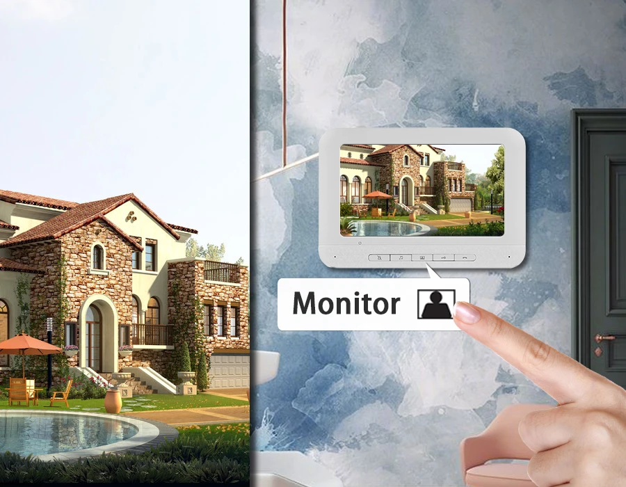 7-дюймовый ЖК-монитор с ночным видением, включая одну уличную камеру 1000TVL и один внутренний монитор, который сочетает в себе функции визуального домофона, наблюдения в реальном времени, дистанционной разблокировки, водонепроницаемости и ночного видения, который широко используется в виллах, квартирах, домах, гостиницах, офисах, общественных зданиях и так далее.