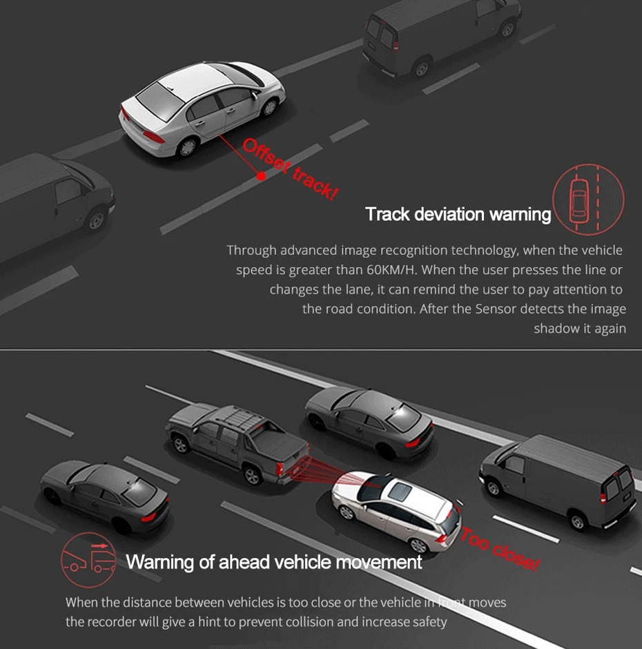 Предупреждение об отклонении от полосы движения, напоминание о переднем автомобиле и предупреждение о переднем расстоянии.