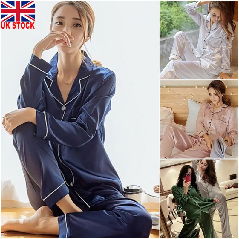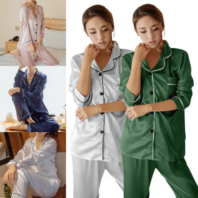 Пижамный комплект Женский атласный, однотонный Шелковый Топ с длинным рукавом, на пуговицах, штаны, одежда для сна, домашняя одежда, одежда для сна, синий зеленый розовый белый