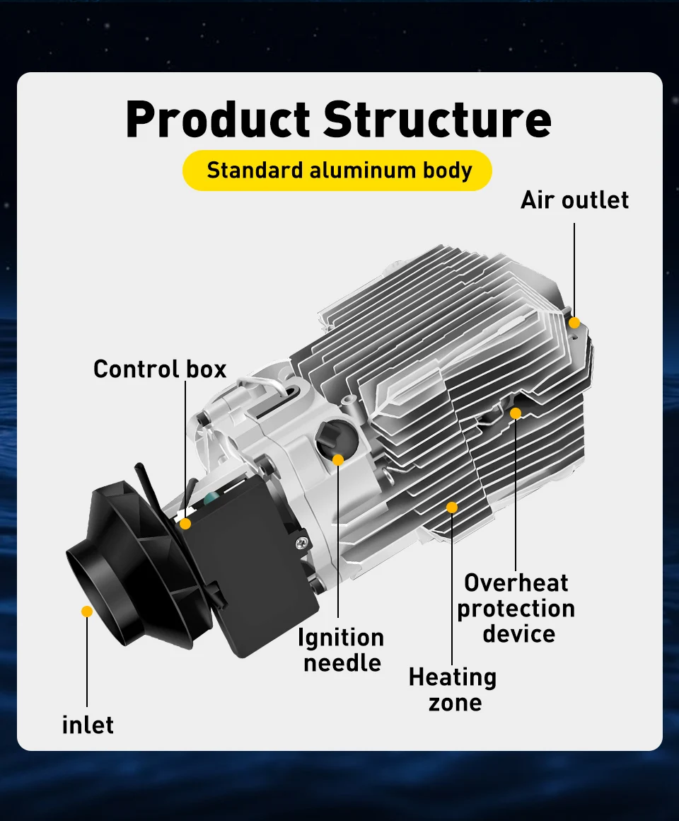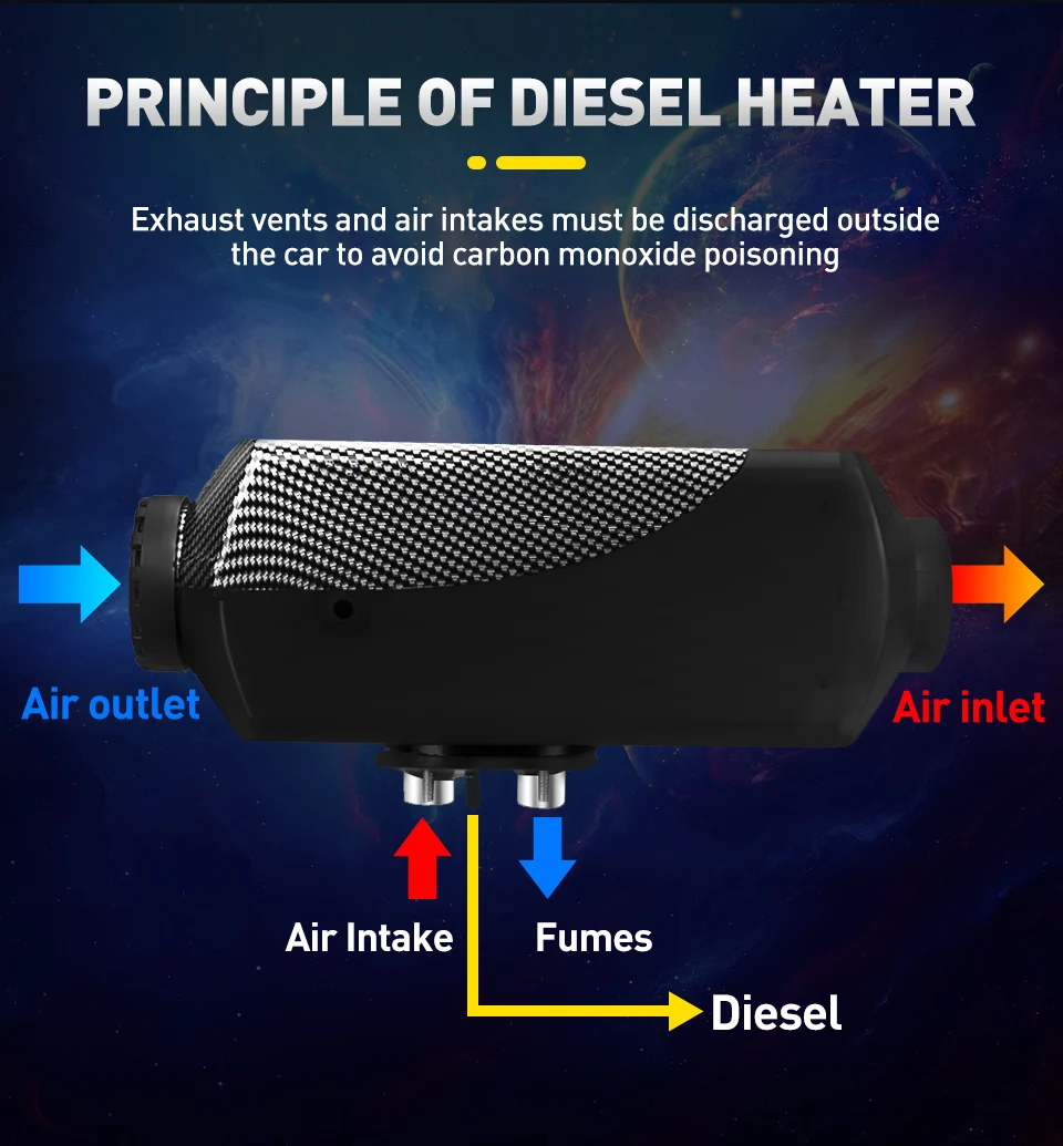 Особенности:-Может использоваться на больших высотах, 4500 метров над уровнем моря.-Пульт дистанционного управления нагревателя может быть подключен к выключателю-Нагреватель может быть применен для нагрева кабины грузовых автомобилей, va.nss, аккумуляторных батарей автомобилей и всех видов других транспортных средств.-Может устранить Мороз окна;-Экологически чистый продукт, низкий уровень выбросов, низкий расход топлива; Выхлопные газы нагревателя для удовлетворения требований к выбросам двигателя евро IV.-Компактная конструкция, легко устанавливается;-Может демонтировать новый автомобиль при замене транспортного средства.-Летучая технология, с помощью керамической вилки зажигания нагревание топлива испаряется в газ, быстрое зажигание, полное сгорание.-Использование передовой технологии автоматического управления с надежными ненормальными условиями эксплуатации.-Топливо, электричество, температура может быть установлена произвольно.-Можно использовать дизельное топливо