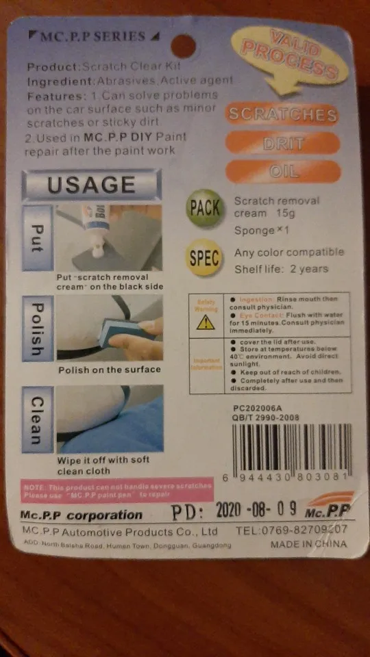 Этот продукт работает блестяще, если вы передали краску на панель вашего автомобиля без глубокой царапины или вдавливания. Это не волшебная смесь красок по царапинам. Состав является, по крайней мере, полировкой, которая может удалить краску, которая была передана. К сожалению, мой завод пальто на панели все еще было хорошим.