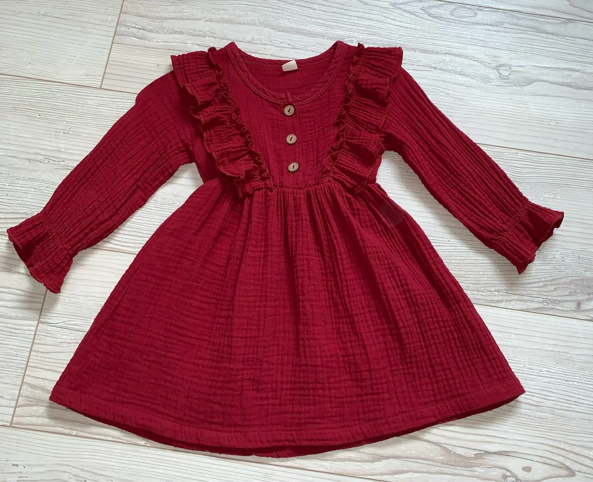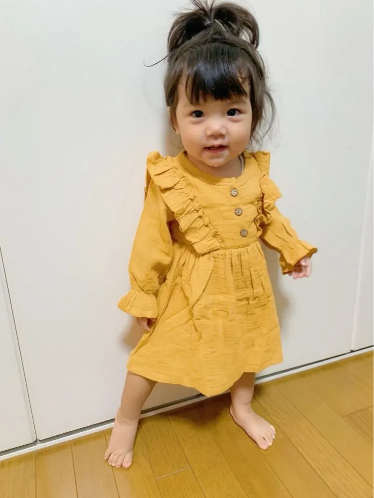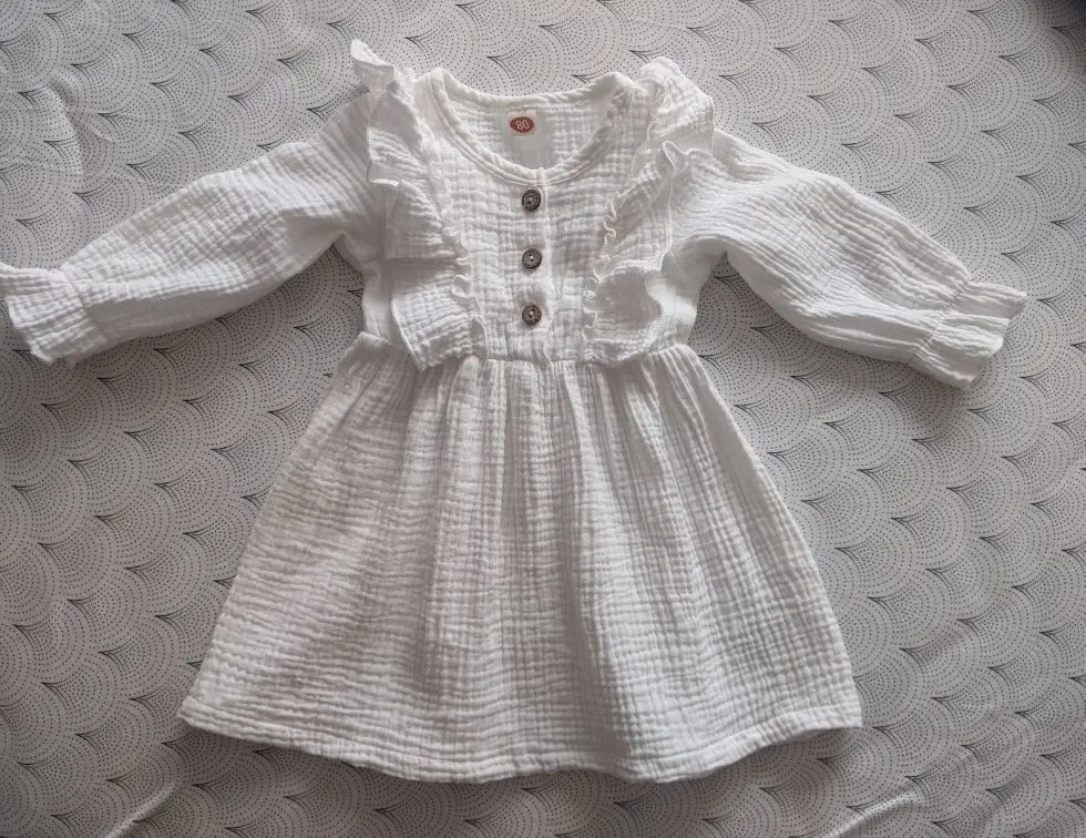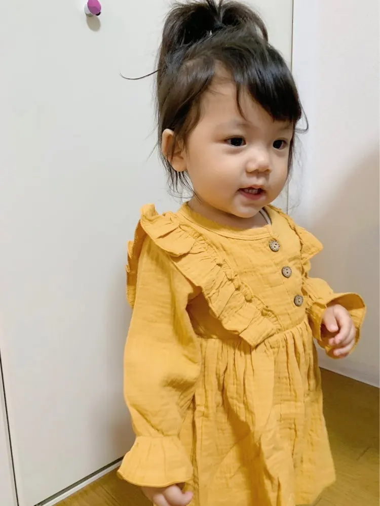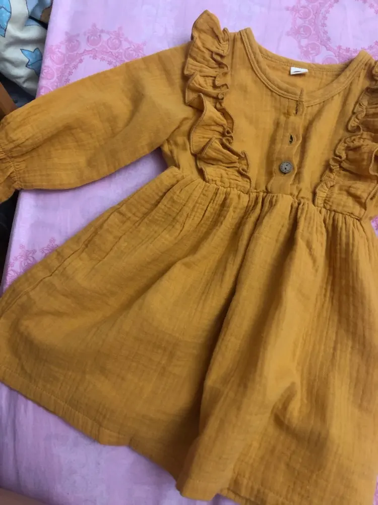 Осеннее платье для маленьких девочек, однотонное хлопковое льняное повседневное вечерние чное платье с оборками и длинными рукавами, От 0 до 5 лет