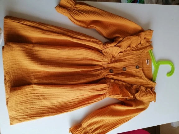 Товар загалом відповідає опису, тканина приємна на дотик, після прання не втратила форму. Колір яскравіших і більш зелений, ніж на фото. Плаття гарно виглядає на дитині. Коли отримала, то на платті було багато залишків від ниток, але це не критично. Трішки маломірить. Взяла розмір 4т (100), дитині 3 роки, ріст 94 (плаття впритик). Доставка 3 тижні