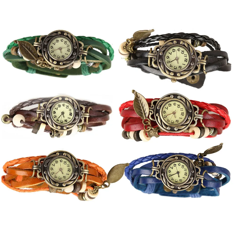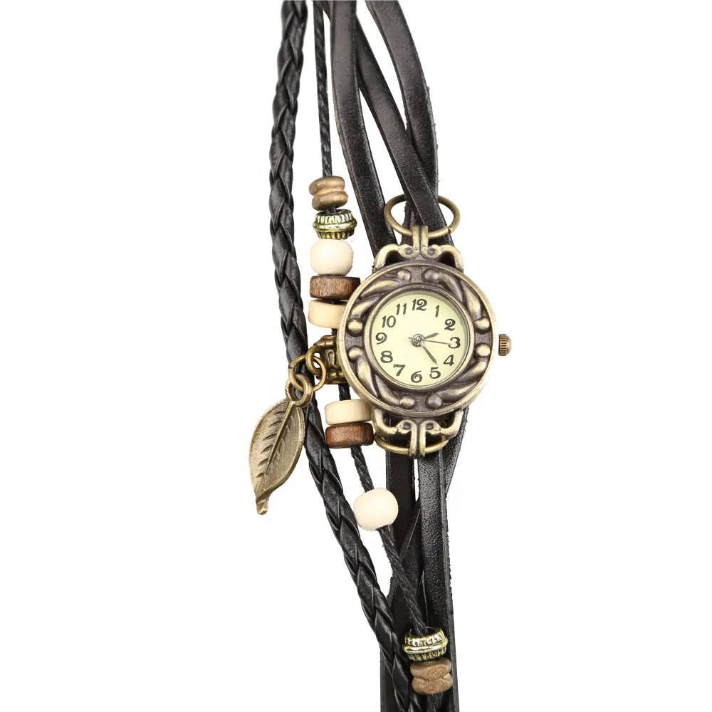 Винтажные кварцевые наручные часы с плетеным кожаным ремешком и бусинами для женщин