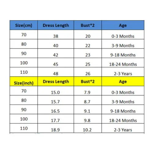 РазмерыДлина платьяБюст * 2Возраст7038 см20 см0-3 месяца