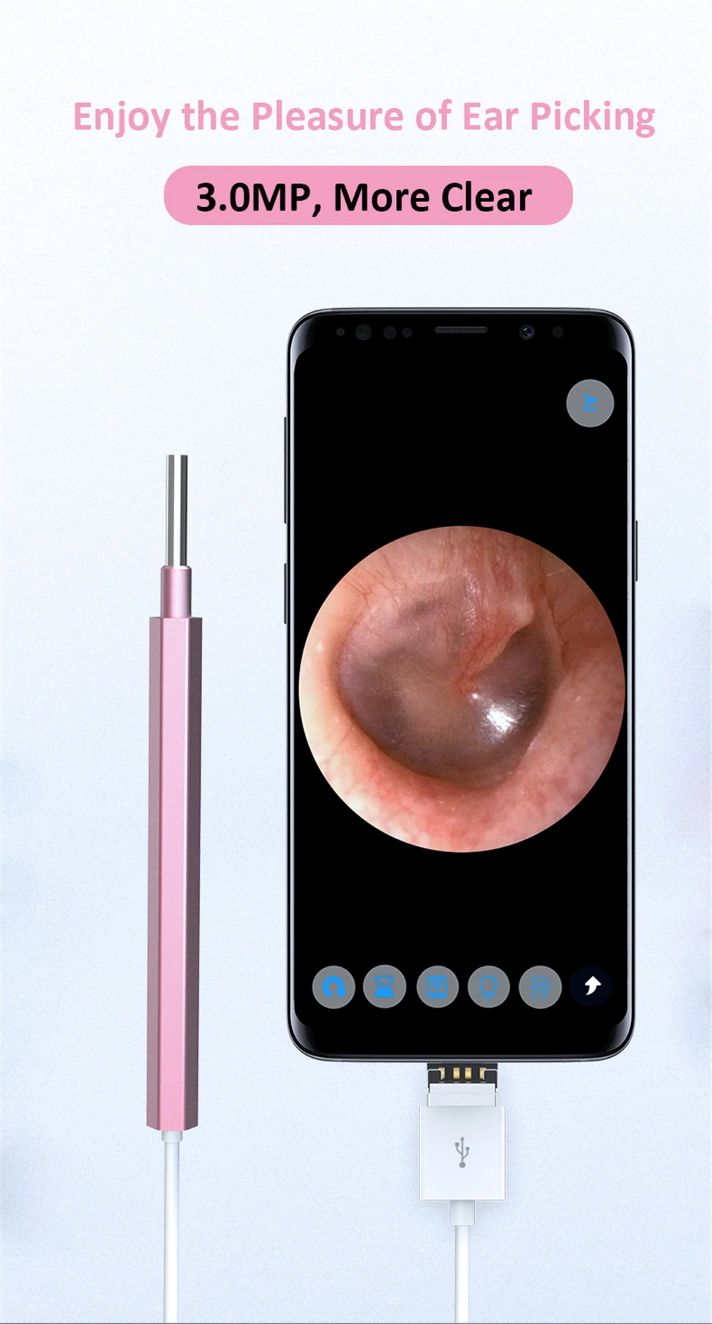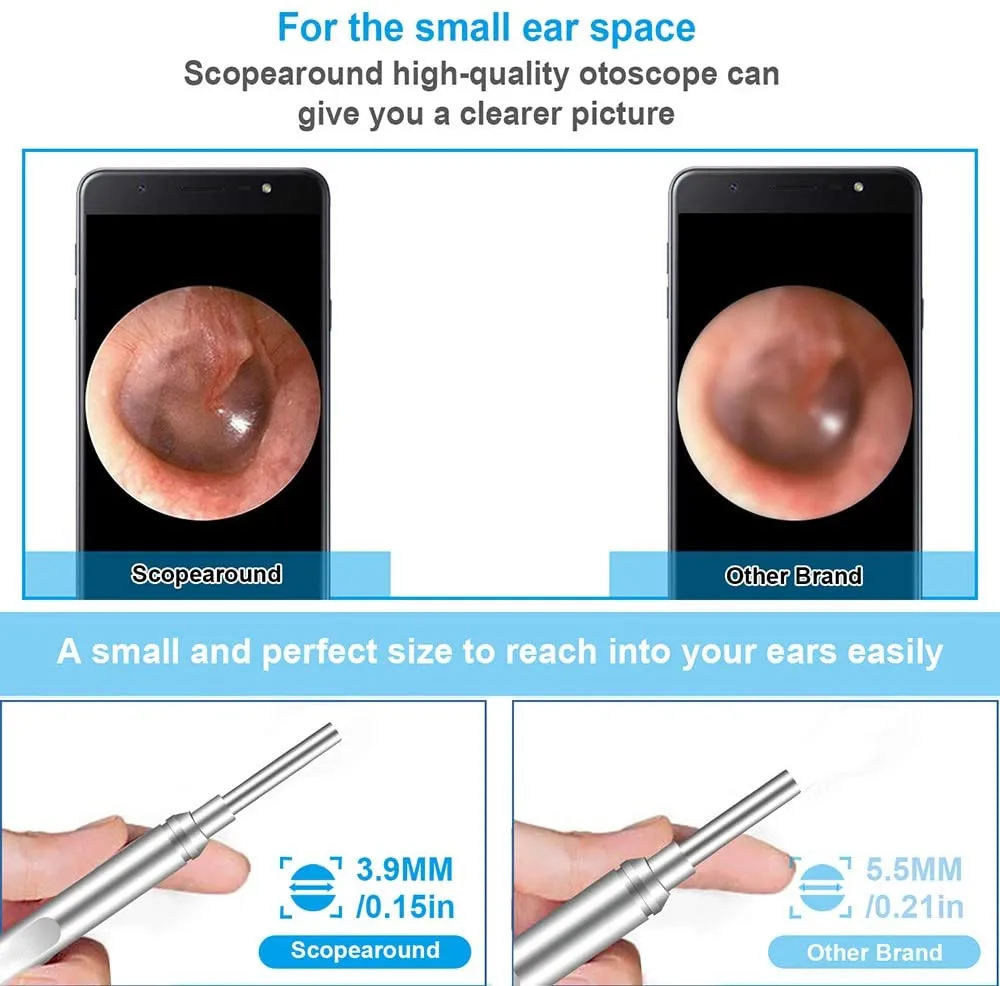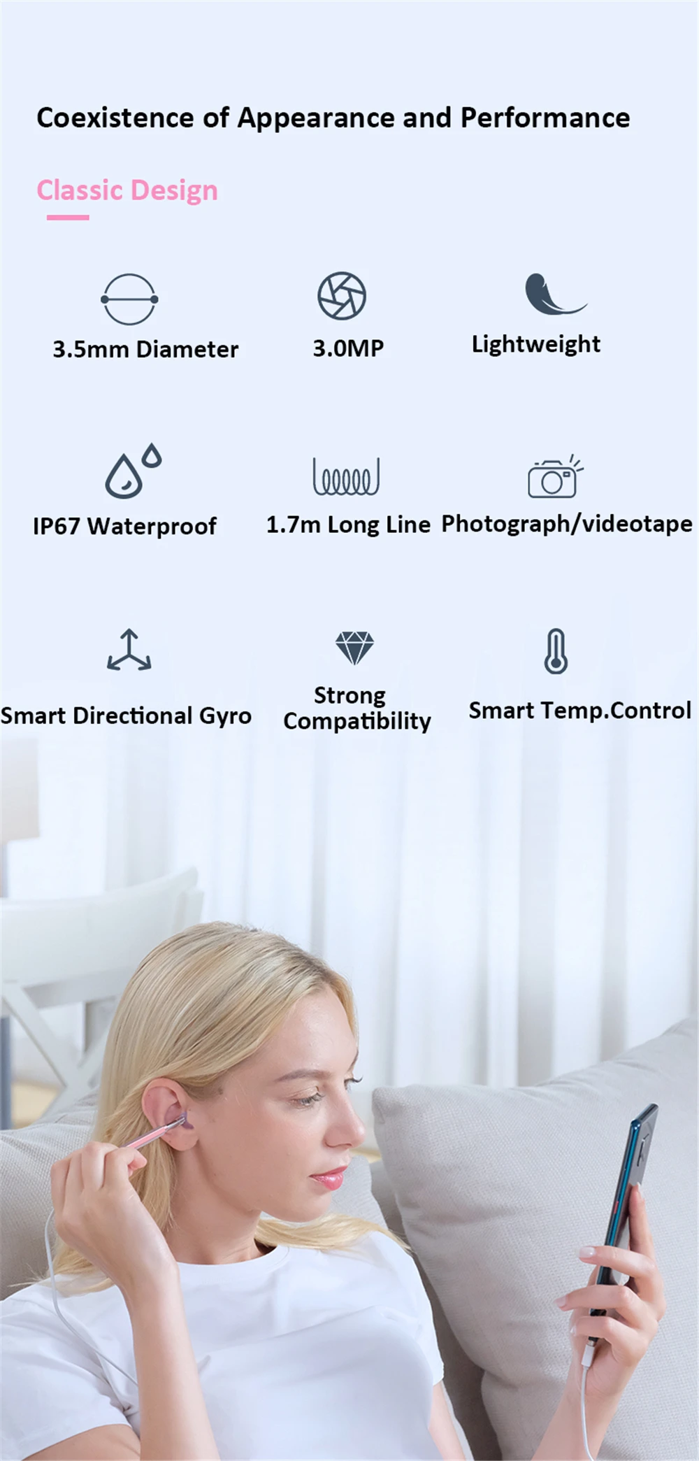3,720 P HD Ушная Камера: 4,3 мм камера наблюдения с 6 регулируемыми светодиодными лампами может работать четко в темноте и узком ушном канале. Не переживайте о перегреве! Обновленный чип больше не заставит вас чувствовать перегрев. Он подходит не только для peolpe, но и для вашего питомца, вы можете использовать для проверки ушной раковины и ушного клеща.
