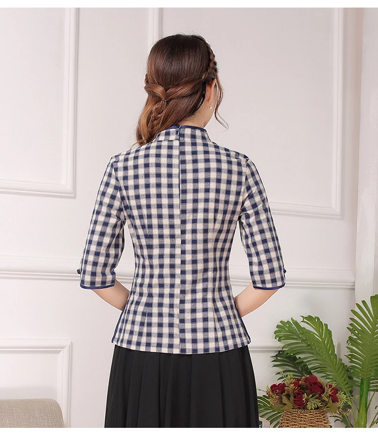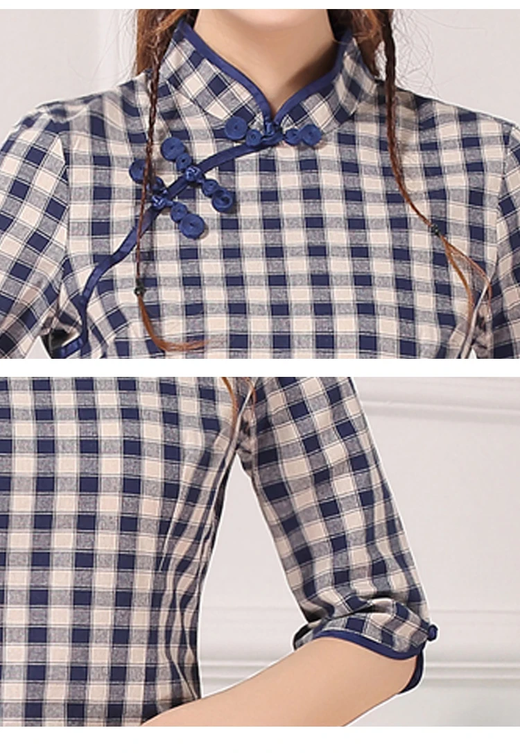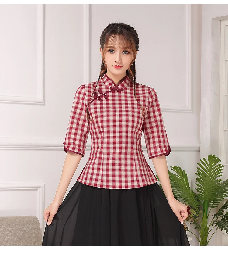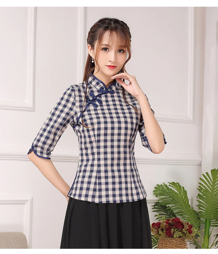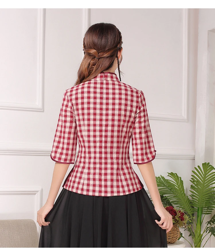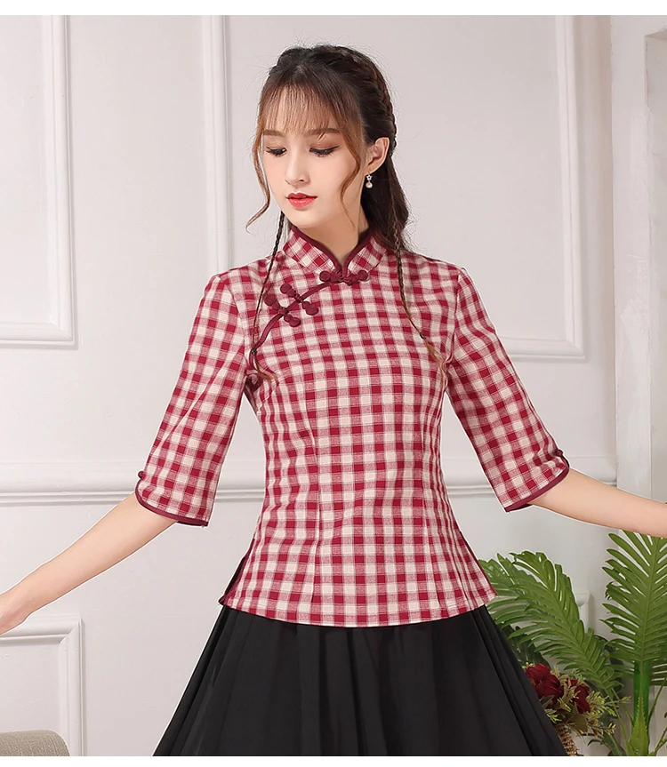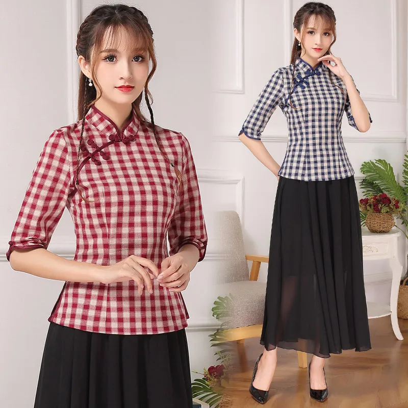 Женская рубашка в клетку KYQIAO, синяя или красная рубашка в этническом стиле с полурукавами и воротником-стойкой, в интернет-магазине в Китае, осень 2019
