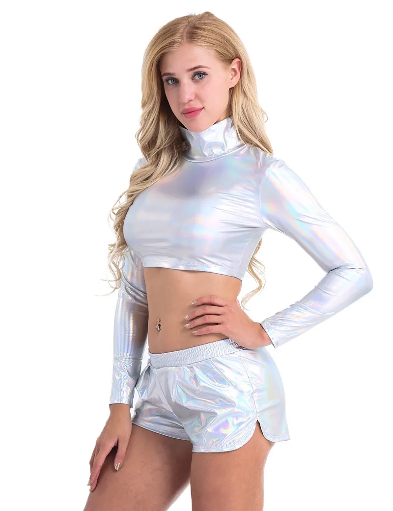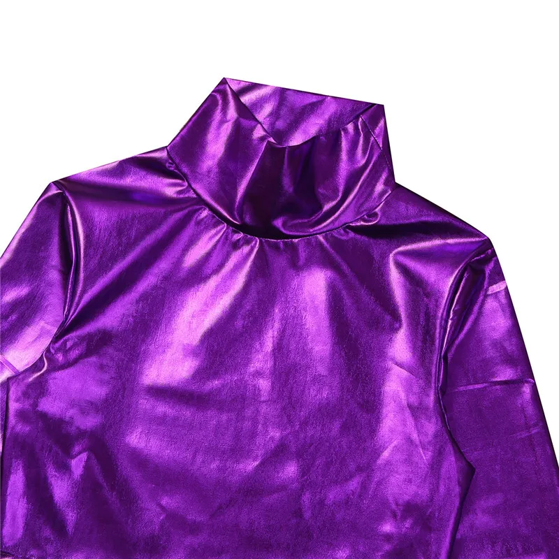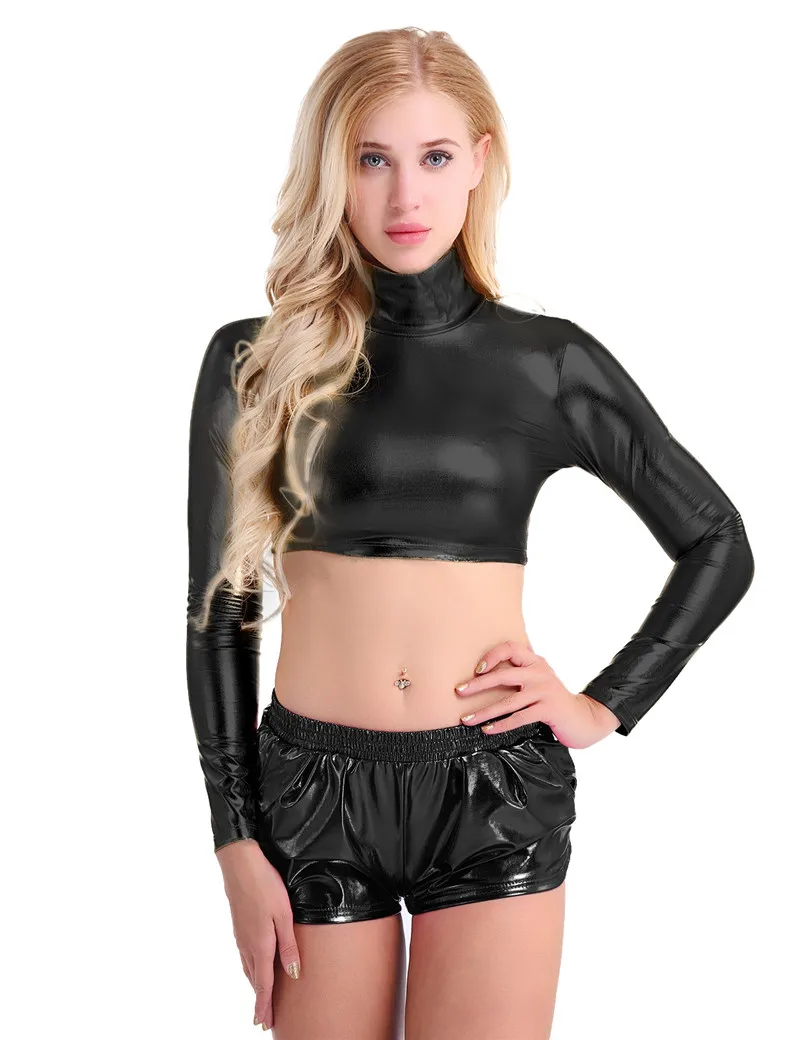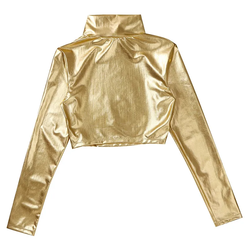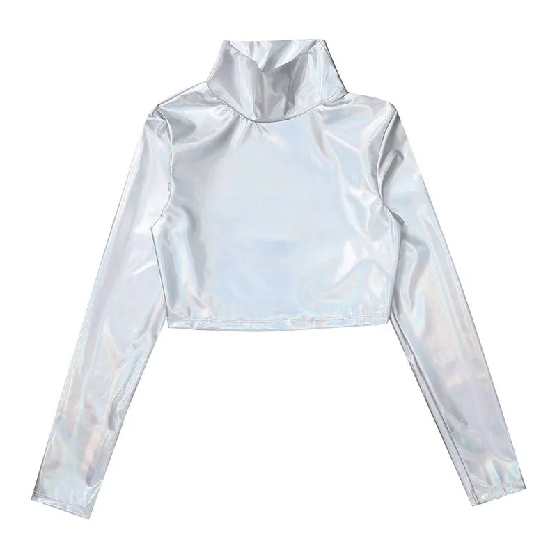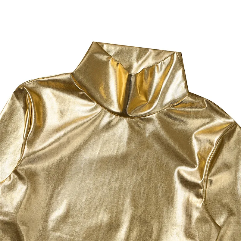 Женский блестящий топ TiaoBug из лакированной кожи с длинными рукавами и высоким воротником для клубной вечеринки сценического представления Rave костюм топы для танцев на шесте