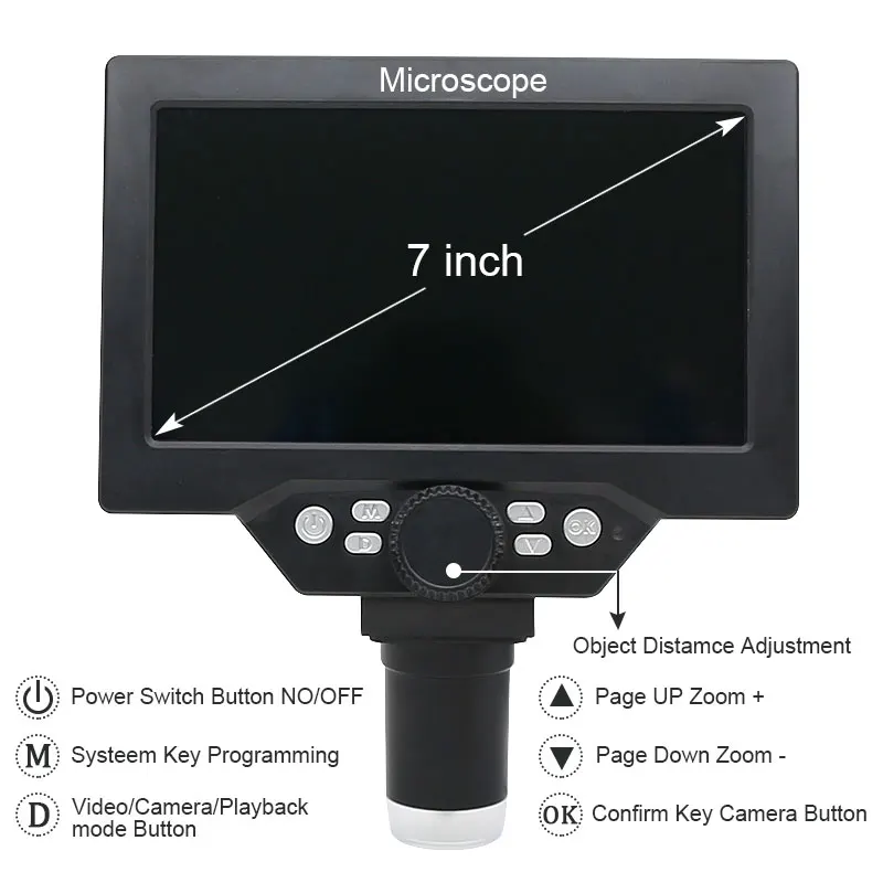 7 дюймов HD ЖК-экран цифровой микроскоп, кронштейн может поворачиваться под любым углом наклона вперед и назад, чтобы удовлетворить ваши потребности, в то время как объектив поддерживает 1-1200X с непрерывным масштабированием. Это, безусловно, может быть прекрасным подспорьем для вашей повседневной работы. Контроль качества, инспекция цели образования, промышленная печать, промышленная инспекция, PCB материал, ювелирные изделия и штамп коллекция, текстильная промышленная, биологическая Инспекция