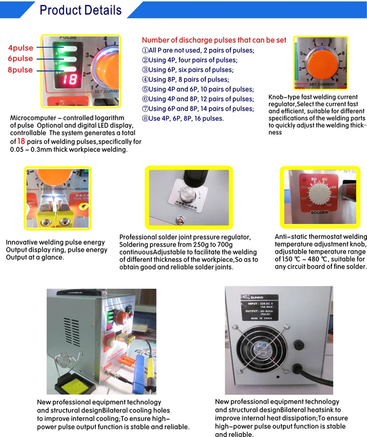 Деталь точечной сваркиПоставка Напряжение 220V / 50 HZ, переменный ток, 110 В/60 Гц (Выберите)Мощность 3,2 кВт (мгновенно)Ток 800 АЭлектрический выключатель утечки 60 A или более 60 AВремя двойного импульса 1 ~ 10 мс(Мгновенное время сварки) (регулируется, регулируя ручку сварочного тока)Время четырех импульсов 2 ~ 20 мс (регулируется)(Мгновенное время сварки)Время восьми импульсов 8 ~ 80 мс (регулируется)(Мгновенное время сварки)Диапазон сварочных штифтов 5 - 6 ммСварочное давление 300 - 500 гРегулируемое расстояние сваркиПодходящая толщина сварки 0,03-0,3 мм для фиксированной медной головки0,03-0,2 мм для мобильного сварочного пераЧасть паяльникаТемпература 150 °C ~ 450 °CМощность 50 ВтВыходное напряжение 20 В постоянного тока