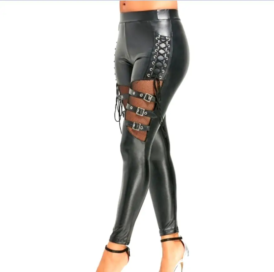 Сексуальные женские леггинсы из искусственной кожи на шнуровке, чер...