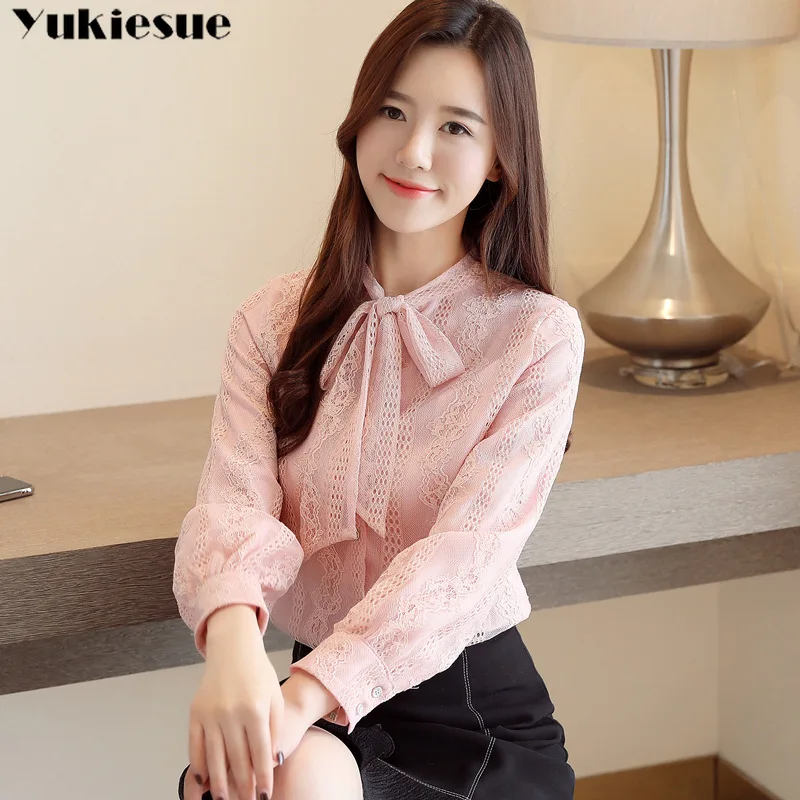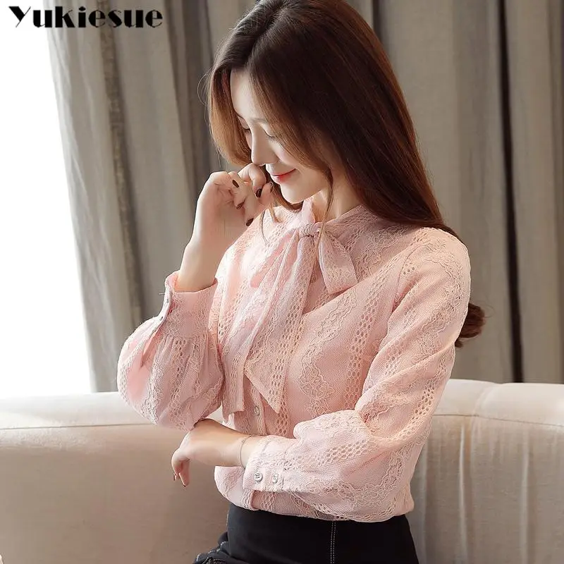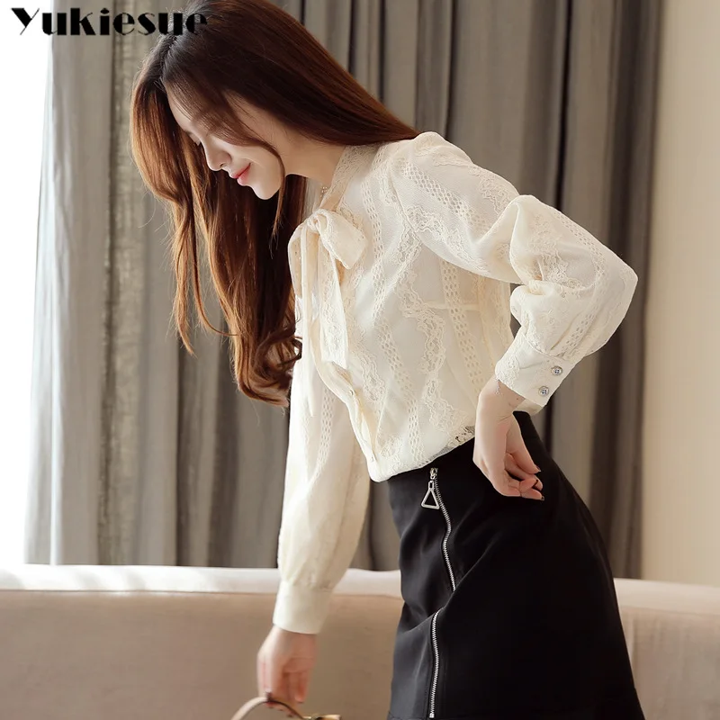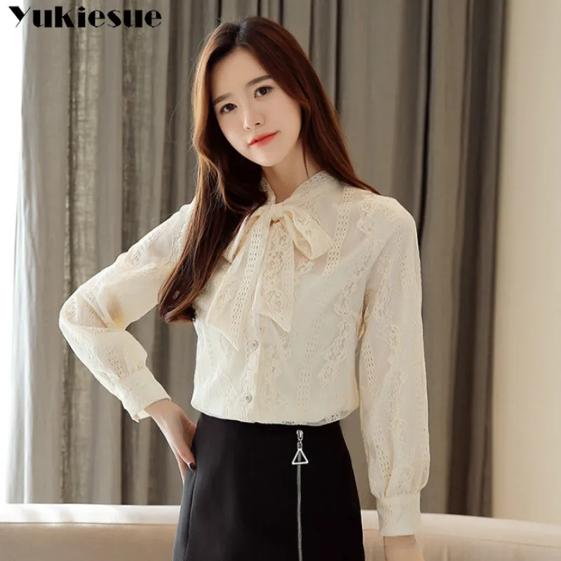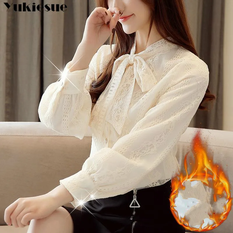 Женская кружевная блузка, зимняя теплая элегантная рубашка с длинными рукавами-фонариками и бантом, для работы и офиса