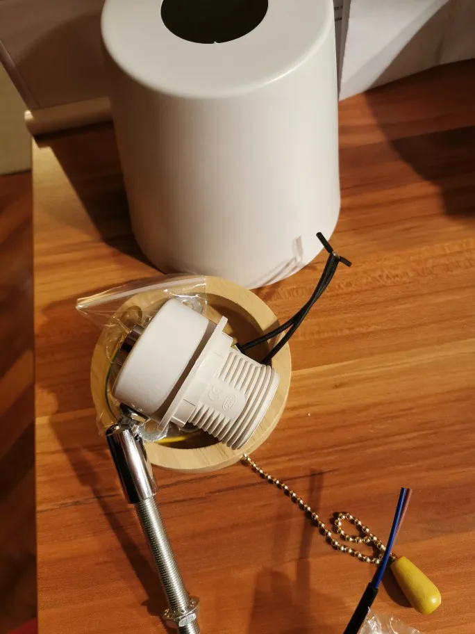 Приезжают лампы в пенопластовых боксах, хорошо упакованные, без повреждений. В комплекте есть все для крепления. Основа действительно деревянная. Но она маловата для того количества проводов, клеммников + включатель и крепление, что сложно все это разместить внутрь настенной основы без повреждений. У нас сначала что-то хрустнуло. На другой лампе зажало цепочку, что она не двигалась. Цепь пластиковая. Мне еще не понравилось, что она желтая, а не серебро. Не очень, на мой взгляд, подходит. На стене смотрятся неплохо.