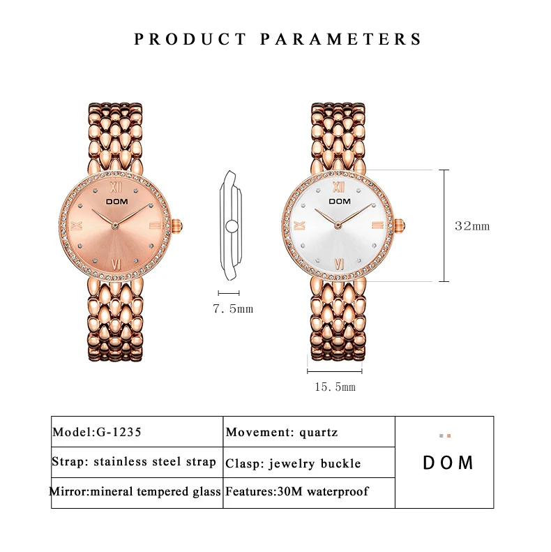 Бренд: DOM-Дисплей: аналоговые кварцевые часы-Стиль: Модный, Повседневный, роскошный, спортивный,-Особенности: ВодонепроницаемостьОсновная особенность:-100% новый с биркой и высоким качеством;-3 АТМ/100 м Водонепроницаемость (поддержка холодного душа и плавания, не использовать часы под водой, не поддерживать горячую воду);-Качественный чехол из сплава;-Качественный ремешок из нержавеющей стали;Спецификация приближения:-Чехол Диаметр: 3,2 см-Чехол Толщина: 0,75 см-Ширина ремешка: 1,55 см-Общая длина: 19,4 смПосылка включает в себя:-Часы DOM-1 шт.-1 x DOM BoxЧасы DOM, женские модные часы, 2019, Лидирующий бренд, женские модные наручные часы, водонепроницаемые, женские часы со стальным браслетом, G-1235G-7M