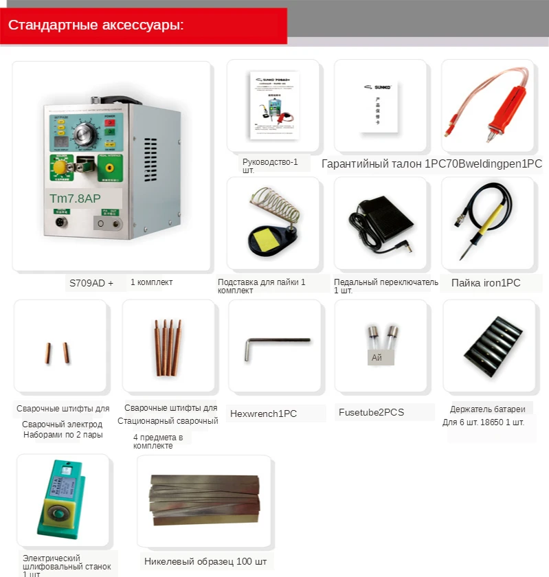 Сварочные части: Напряжение питания: 220 В переменного тока ± 20 в Мощность: 1,9 кВт (Мгновенная) Сварочный ток: 500A Время 2:1-10 мс (настройка) Время 4:2-20 мс (настройка) Время 8:8-80 мс (настройка) Пайка деталей: Температура пайки: 150-450 Точность температуры: ± 5 Выходное напряжение: 20 В постоянного тока Мощность: 50 Вт Время нагрева: от 6 до 8 с до 300 Размеры: 140x245x200mm Вес нетто: 7 кг Описание: * 4 в 1 машине. * Фиксированная Сварка. * Постоянная температура пайки. * Индуктивная разрядка сварки. * Подвижная Сварка. * Совершенно новый Индуктивный разрядки сварки режиме. Это не нужно контролироваться при помощи педаль управления для сварки. * Он будет приваривать сразу же при сварке головных работ. * Он управляется микрокомпьютером для точной сварки и увеличения консистенции сварки в контроллере мощности сварки. * 4 в 1 дизайн для сварки и пайки в одной машине с многофункциональным для изготовления электронного продукта. * Есть фиксированная сварочная головка и подвижный режим сварочной ручки для небольшого компонента и больших деталей для сварки. * Это может быть отрегулировано высокой мощности в 1200A для сварки налобный фонарь для сварки 0,35 мм никелированным покрытием. * Это управление энергией и экономия энергии. * Есть 2-18 для выбора, которые могут сварить различную толщину. * Сварочная ручка очень проста и удобна в использовании. * Ручка для регулировки и электрического тока удобна для изменения и электрического тока. * Светодиодный дисплей с двумя рядами четко определяет данные. * Паяльник T12 может быстро паять и использовать дольше. * Подходит для сварки различных никелированных материалов. * Он подходит для любого освещения с дизайном светодиодный подсветки. Посылка включает в себя: 1 x S709AD + машина 1 x Руководство пользователя 1 х сварочная ручка 1 x паяльник 1 x полка для паяльника 1 х педаль управления 4 x сварочная игла (для фиксированной головки) 2 x сварочная игла (для сварочной ручки) 1 x ключ, дюймовый стандарт 2 x трубка Предохранителя 1 x электрический шлифовальный станок 1 х батарейный блок 50 x никелирование