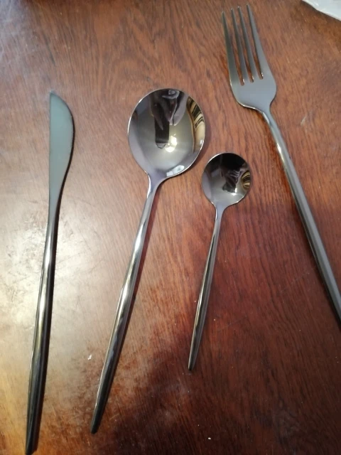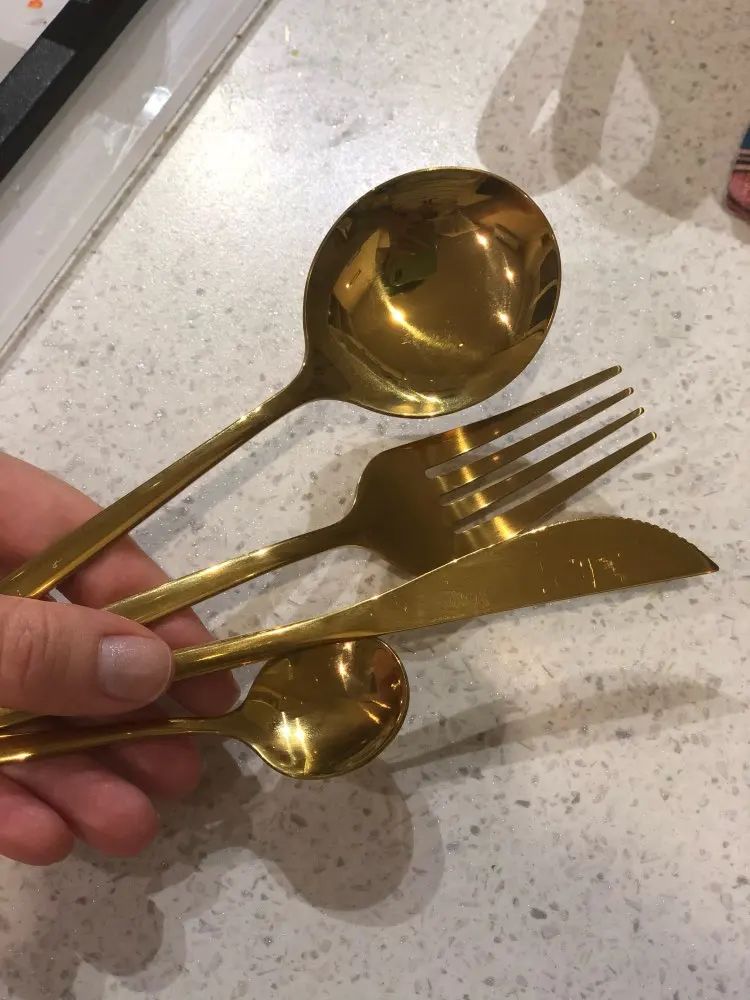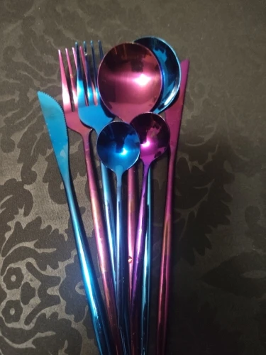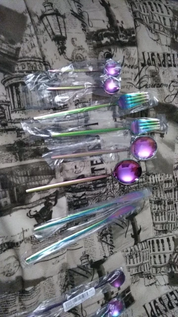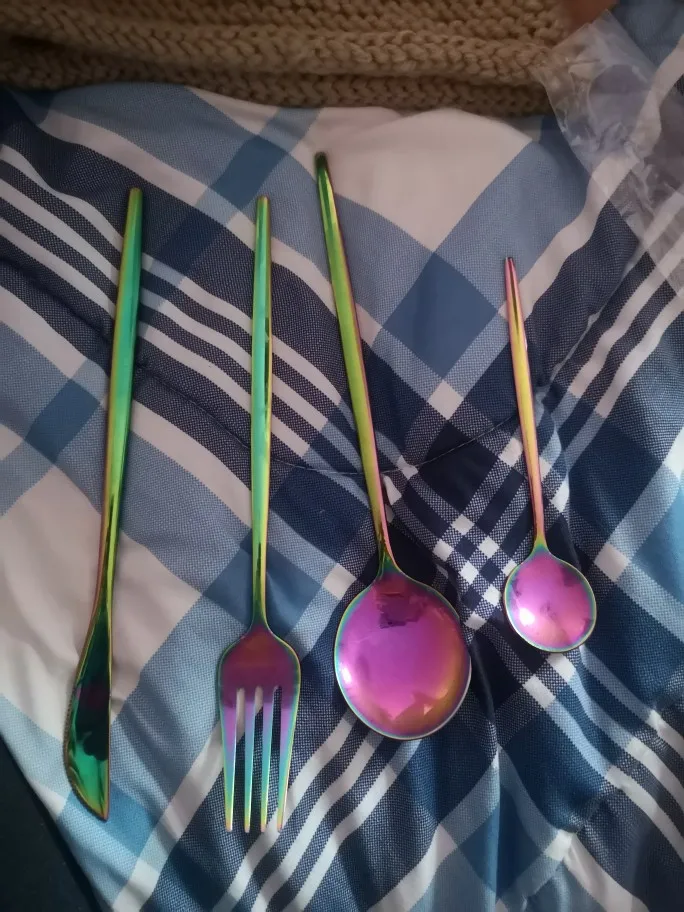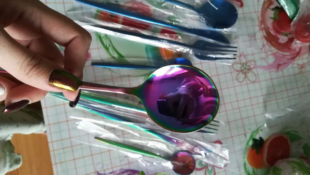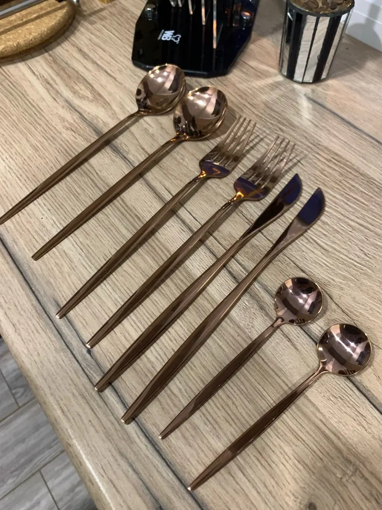 Очень красивые приборы, брала сначала один комплект на тест, всё отлично. Дозаказала ещё 3 комплекта. Есть незначительные непрокрашенные зоны между зубчиков вилки.