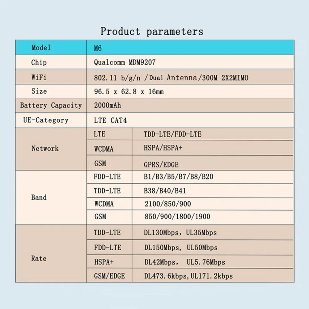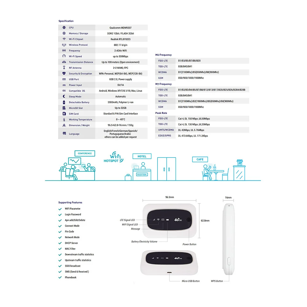 Если вы не знаете сетевой диапазон, пожалуйста, проверьте frequncy band Узнайте его: https://en.wikipedia.org/wiki/List_of_LTE_networks.,,mainly предназначен для SOHO, пользователей транспортных средств, деловых путешественников и путешественников на открытом воздухе, легко подключается и легко переносится в ручную обмен Wi-Fi сигналом