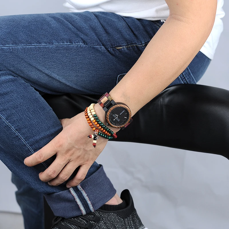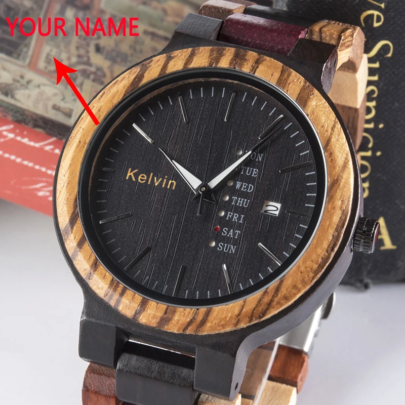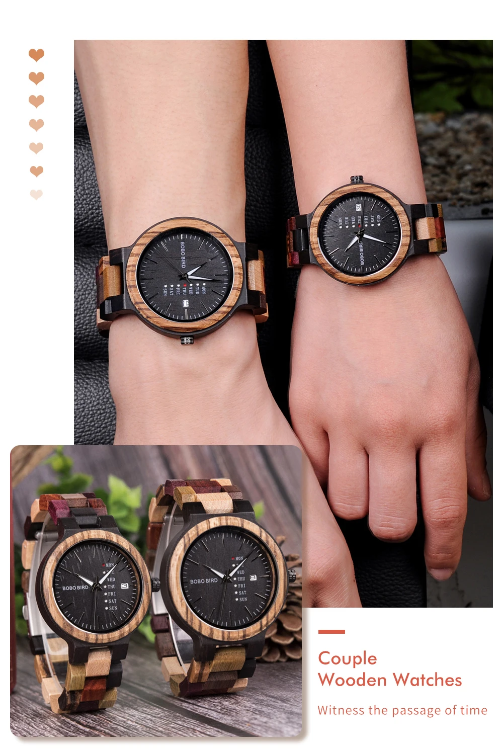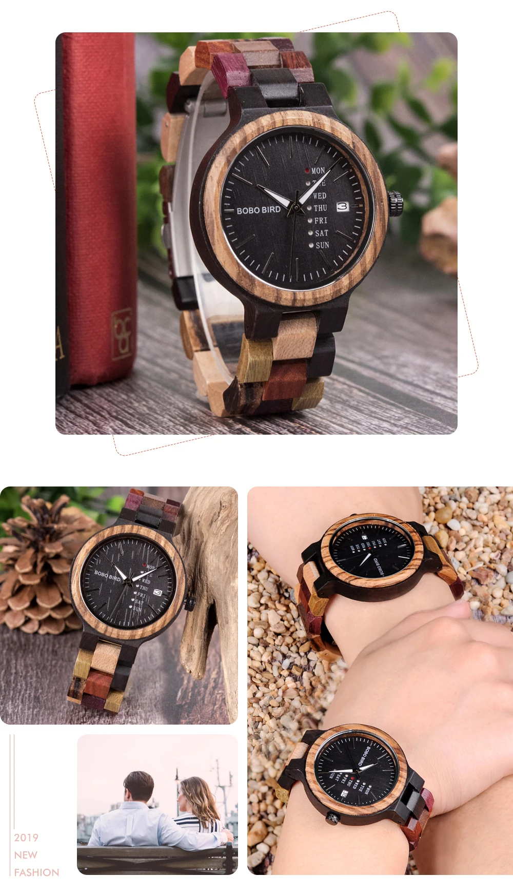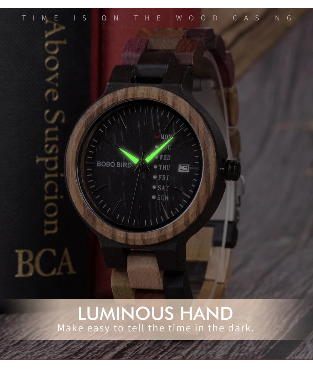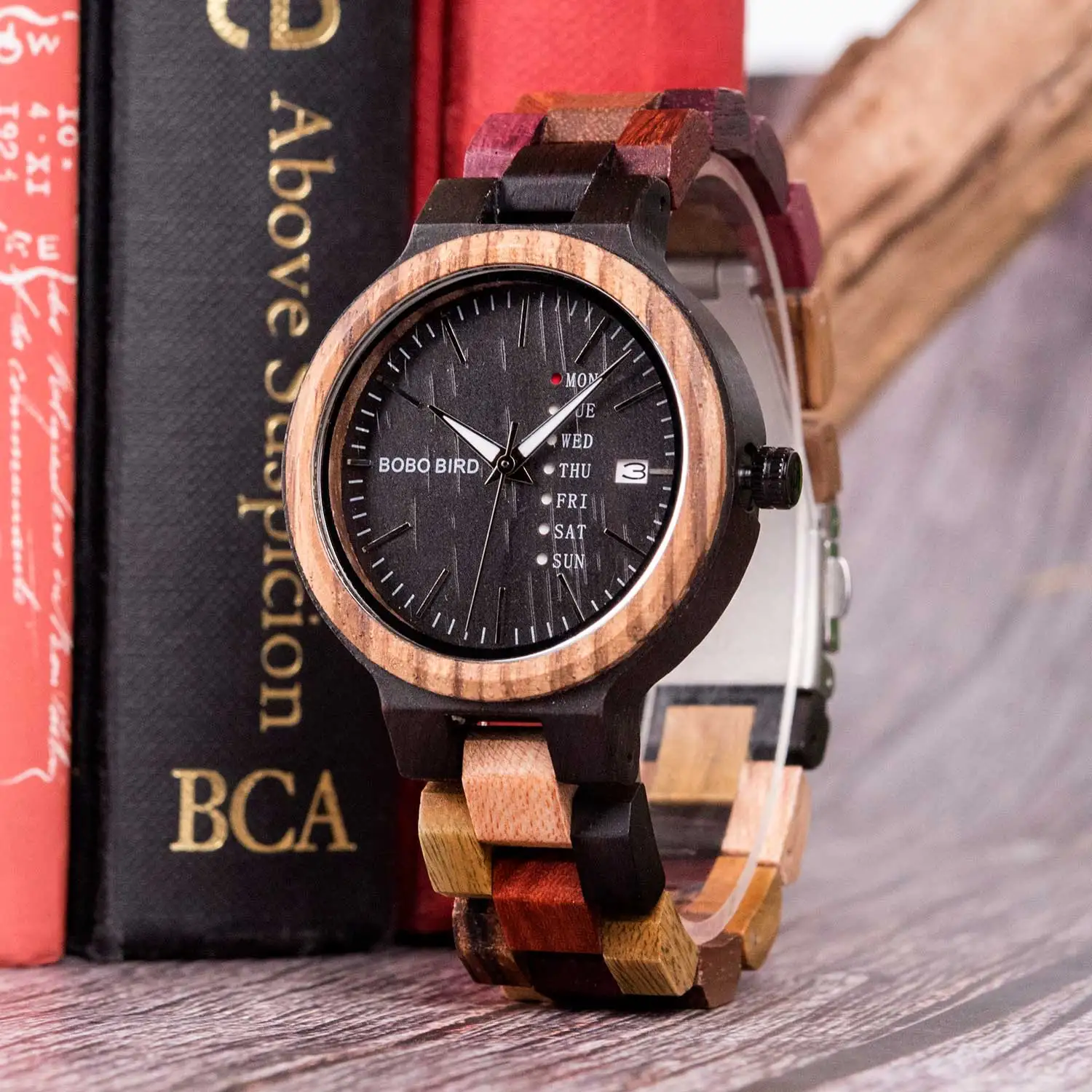 Мужские деревянные часы BOBO BIRD с логотипом на заказ, кварцевые мужские цветные деревянные часы с отображением даты, подарок для парня в деревянной коробке, мужские часы