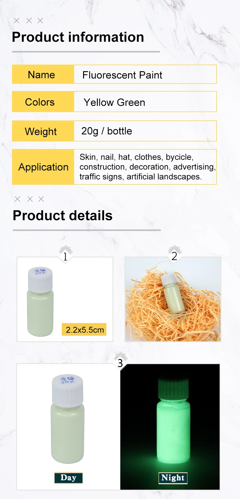 Размер: 20 грамм на бутылку Ингредиенты: синтетическая смола или эмульсия, люминесцентный материал для хранения энергии и другие материалы, нетоксичные, безвредные, не радиоактивные, высокая способность адсорбции окружающей среды. Невоспламеняющийся, Нелетучий. Нет специальных требований к хранению. Низкоуглеродистая Защита окружающей среды, коррозии, влажности и воды. Адаптирована к различным секторам любителей живописи. Художественная живопись. Характеристики: всасывающий светильник, излучающий время 10-20 минут, светится в темноте в течение 6 часов. Использование: светящаяся краска в основном используется для строительства, украшения, рекламы, дорожных знаков, искусственных ландшафтов, а также может использоваться как светящаяся табличка для отелей, торговых центров и особых случаев, А также для аварийных ситуаций низкого уровня. Бумага/керамика/штукатурка/стены/дерево/стекло/пластик/одежда/лампы или посуда поверхность объекта живопись, граффити, украшения и т. Д. Примечание: Из-за условий холодной погоды вы можете получить некоторые сухие продукты, пожалуйста, попробуйте положить их в теплую комнату (температура больше или равна 22 ℃) В течение 24 часов или добавьте немного теплой воды, чтобы разморозить. Если это не сработает, пожалуйста, свяжитесь с нами, мы постараемся сделать все возможное, чтобы дать вам удовлетворительное решение.